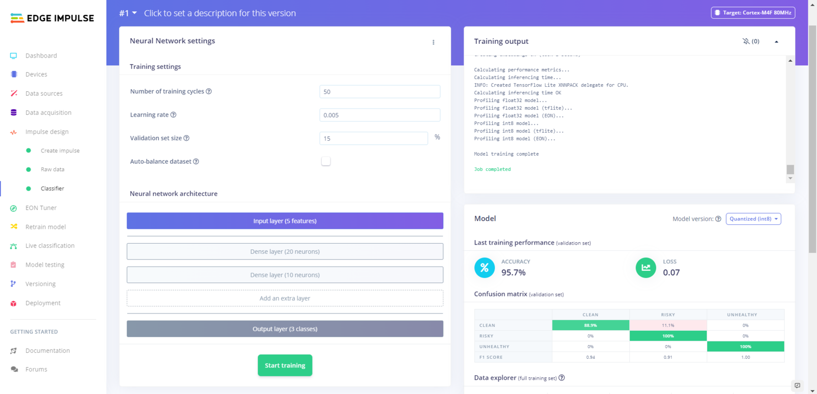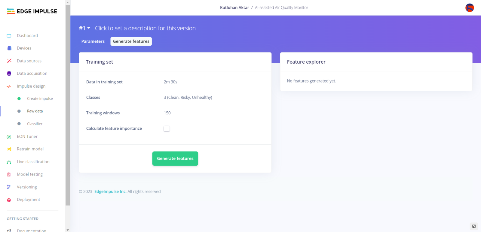 After uploading my training and testing samples successfully, I designed an impulse and trained it on air pollution levels (classes). An impulse is a custom neural network model in Edge Impulse. I created my impulse by employing the Raw Data processing block and the Classification learning block. The Raw Data processing block generate windows from data samples without any specific signal processing. The Classification learning block represents a Keras neural network model. Also, it lets the user change the model settings, architecture, and layers. :hash: Go to the Create impulse page. Then, select the Raw Data processing block and the Classification learning block. Finally, click Save Impulse.