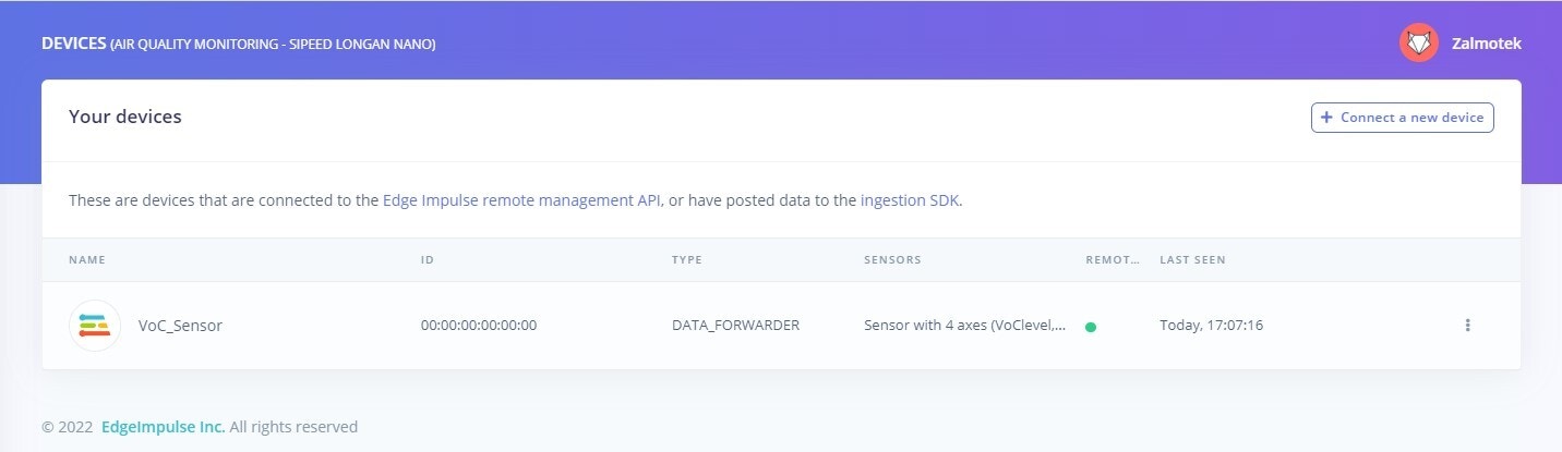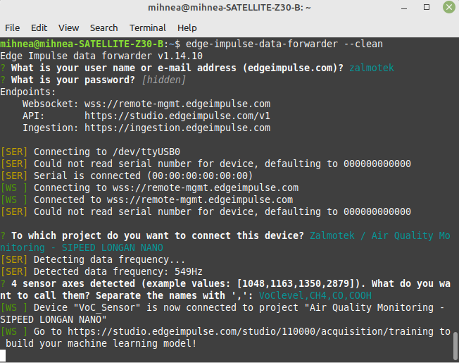 To assign the device to the newly created Edge Impulse project, run the following command:edge-impulse-data-forwarder -clean