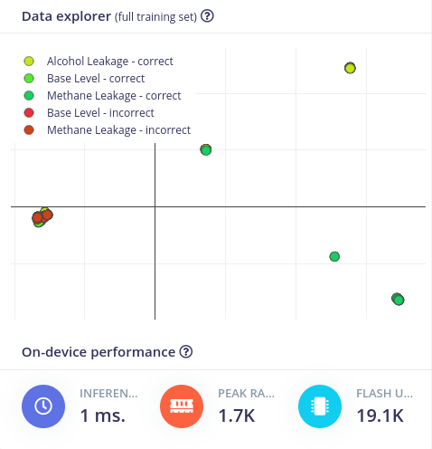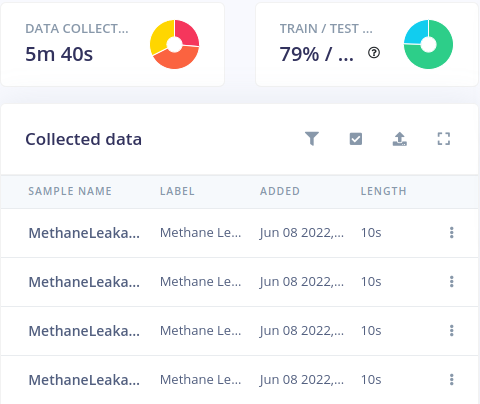 For this particular use case, we will be training a model to detect 2 dangerous situations that may occur in an automobile painting facility: an alcohol leakage and a methane gas leakage. Both of those can be dangerous and hazardous to employees’ health. Navigate to the Data Acquisition screen. Notice that on the right side of the screen the device is present, with the 4 axes we have previously defined in the terminal and the auto-detected data acquisition frequency. Select a sample length of 10 seconds, give the label a name, and Start sampling. When building the dataset, keep in mind that machine learning leverages data, so when creating a new class (defined by a label), try to record at least 2-3 minutes of data.