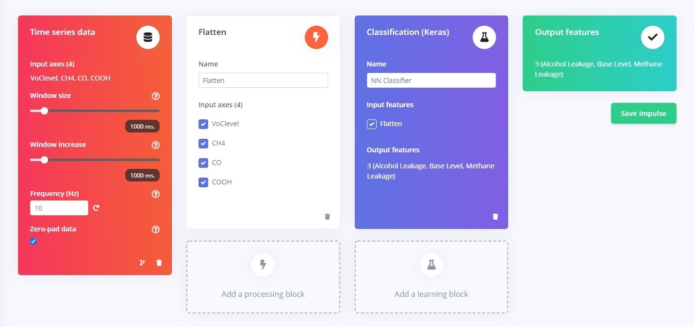 After the data collection phase is over, the next step is to create an Impulse. An Impulse takes raw data from your dataset, divides it into digestible chunks called “windows,” extracts features using signal processing blocks, and then uses the learning block to classify new data. For this application, we are going to use a 1 second window, at a data acquisition frequency of 10 Hz and with the Zero-pad data option checked. We will be using a Flatten processing block, that is fitting for slow-moving averages and a Classification (Keras) as a learning block.