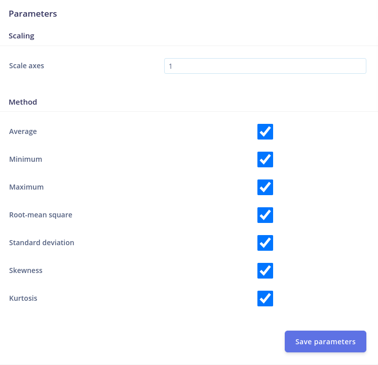 Configuring the Flatten block is a straightforward procedure. Leave all the methods checked and the scale axes to default 1 and click on Save Parameters. Fundamentally, what the Flatten block does is, if the value of Scale Axes is less than 1, the Flatten block rescales the signal’s axes first. Then, depending on the number of methods chosen, statistical analysis is done on each window, computing between 1 and 7 characteristics for each axis.