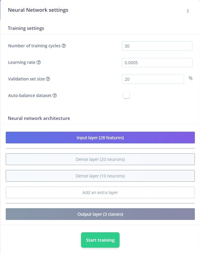 Under the Impulse Design menu, the NN Classifier tab allows us to define several parameters that influence the neural network’s training process. For the time being, the Training setting can be left at its default value. Click on the Start Training button and notice how the training process is assigned to a processing cluster.