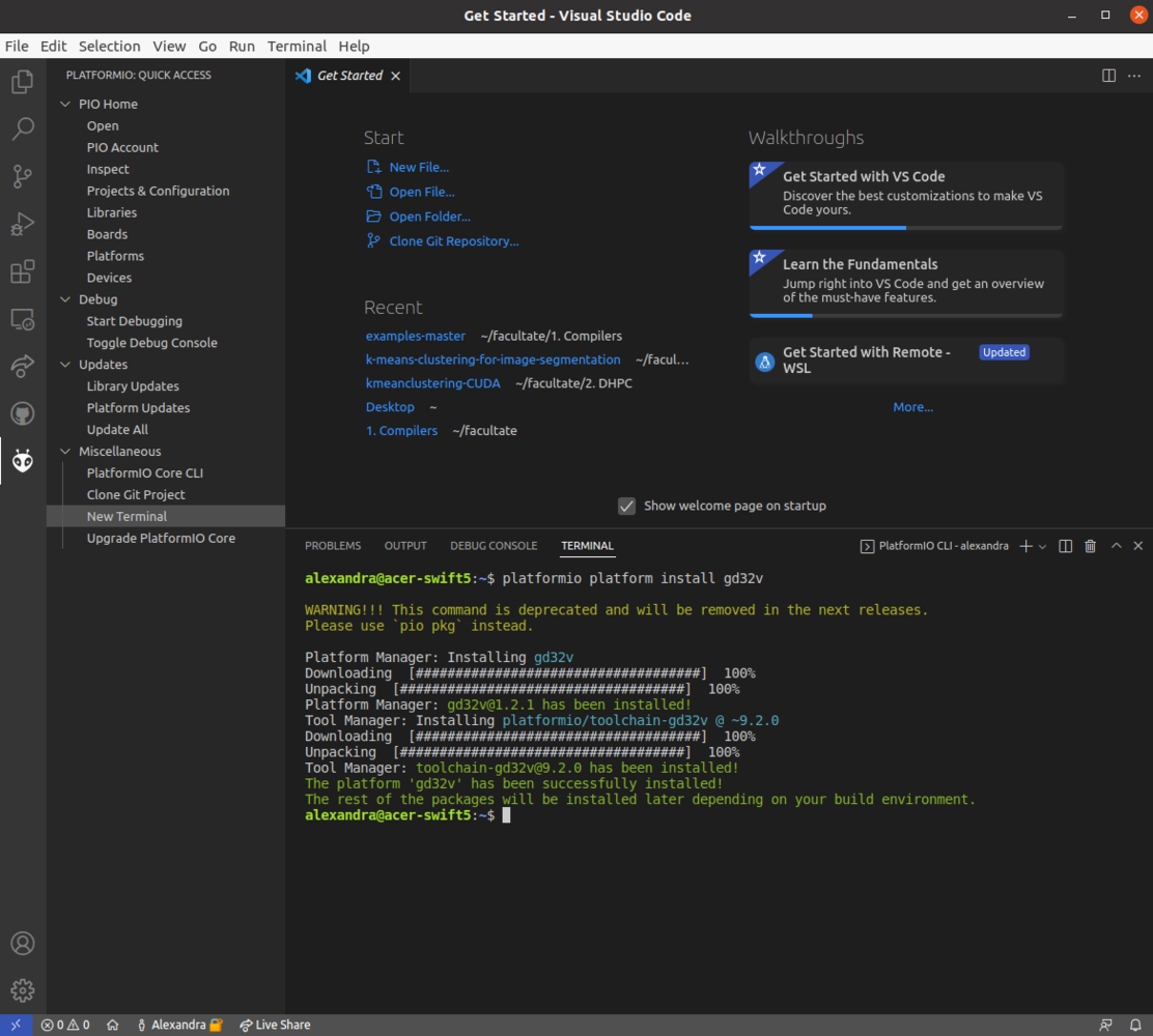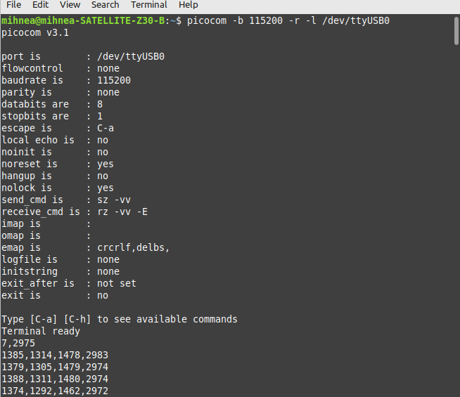 With PlatformIO set up, clone the following GitHub repository in your default projects folder. Click on Files, Open folder, select LonganAnalogRead and open it. To program the Longan Nano, we have used an Arduino Framework branched off from the official Sipeed documentation, developed and maintained by scpcom, available on GitHub.picocom -b 115200 -r -l /dev/ttyUSB0