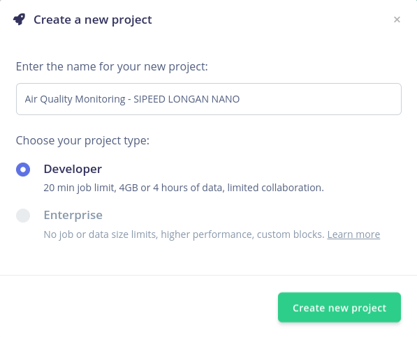 The first step towards building your TinyML Model is creating a new Edge Impulse Project. Be sure to give it a recognizable name, select Developer as your project type, and click on Create new project.