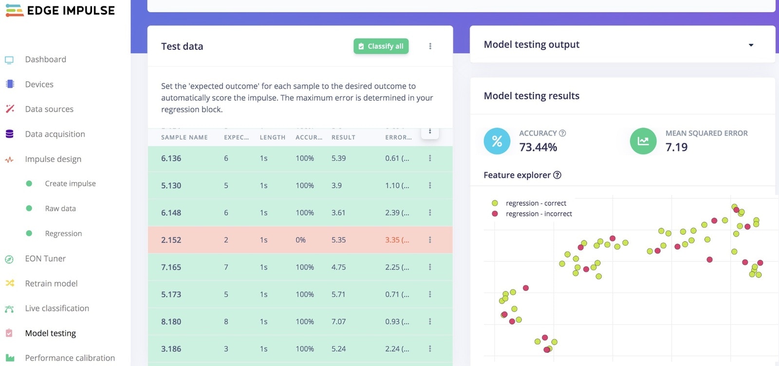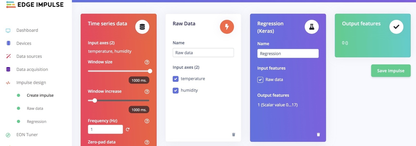 I designed a simple impulse that feeds the previously uploaded training data into a regression model that learns to translate temperature and humidity into a prediction of the number of emergency department visits expected for the hour under those conditions.