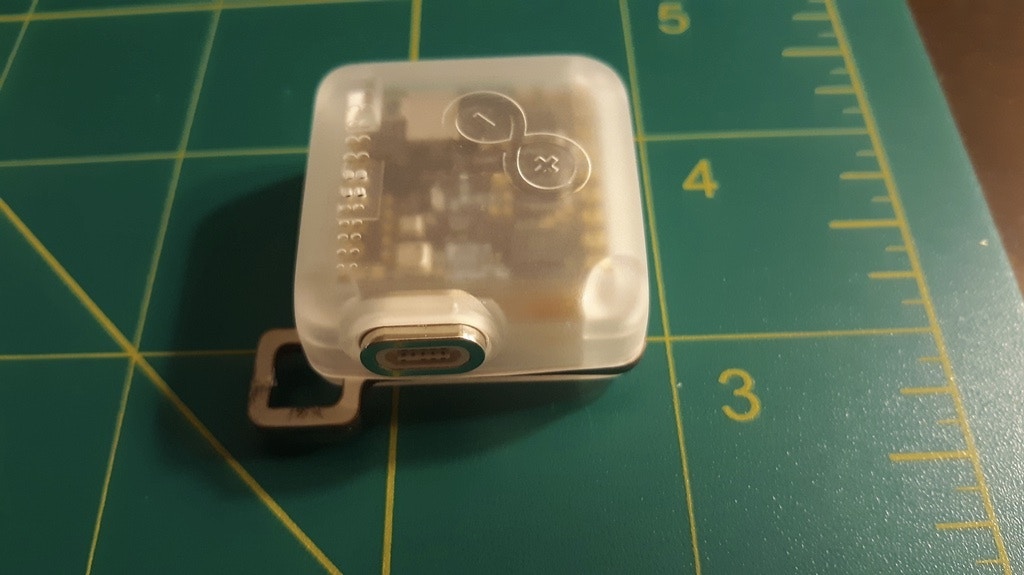 The K-Way jacket is instrumented with an Arduino Nicla Sense ME. The Arduino is housed inside a tiny case and comes wired to a rechargeable LiPo battery. This hardware platform was designed with tinyML in mind, with an Arm Cortex M4 CPU operating at 64 MHz to run local inferences, and a slew of sensors, including a number of motion and environmental sensors.