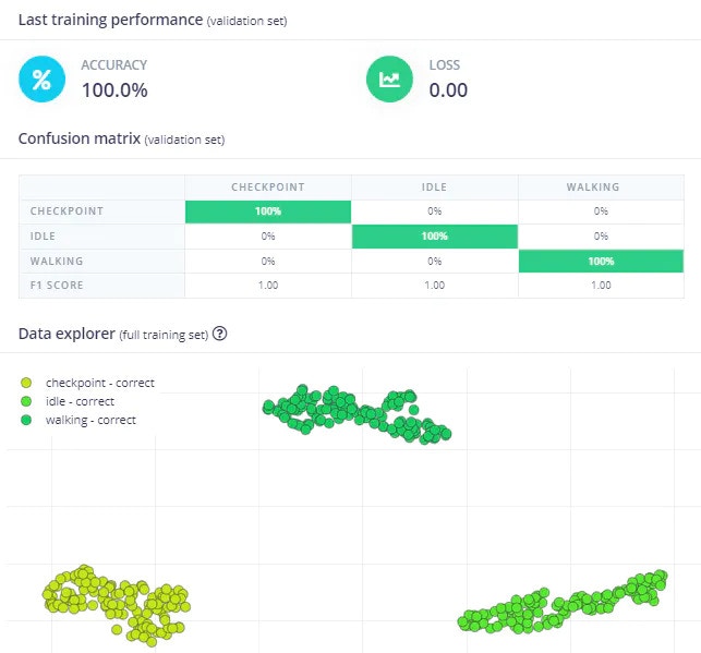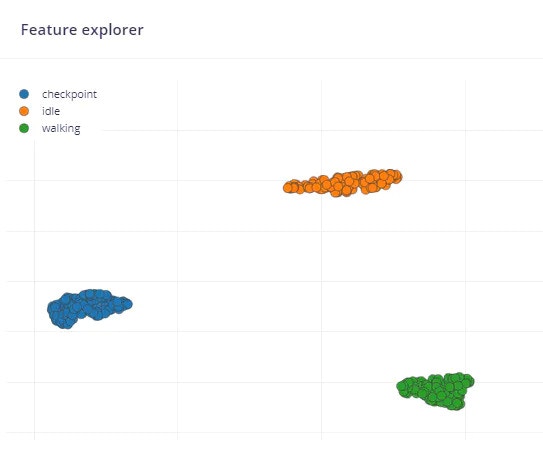 You of course could add additional gestures if you wanted to expand the functionality of the jacket and Nicla Sense ME (an “S” for “selfie” maybe?). Even with just 15 minutes of data (split between Training and Test), there was great clustering of class data: