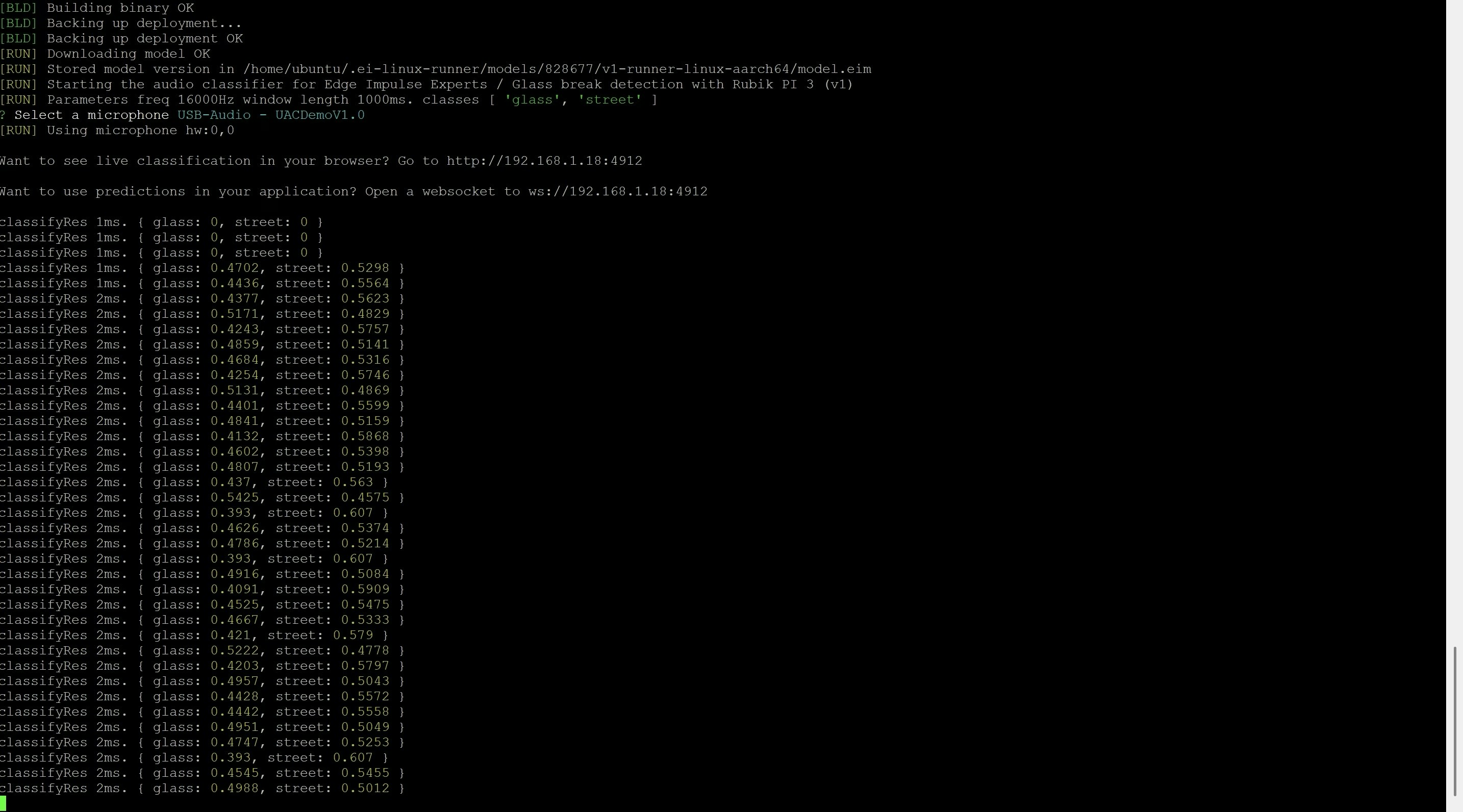 Inference will begin, and any time a glass break is heard, the GPIO pin will be triggered and set high…in this setup illuminating the LED, but application logic could be written to expand functionality for any number of use-cases.