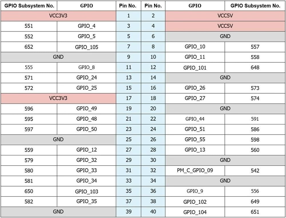 Now connect the LED to GPIO 13 and GPIO 6 (GND). Note that the Rubik Pi will use subsystem number 571 for pin 13. See the complete table below for all of the pin mappings.