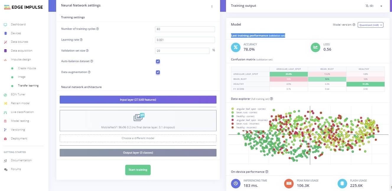 To train a model, MobileNetV1 96x96 0.2 algorithm was then used. As MobileNetV1 is a unique machine learning approach that extends object classification to devices with limited processing power, it allows you to count things, locate objects in an image, and track numerous objects in real time while consuming less computing power. Dataset visualization and separability of the classes is presented in Figure 6. Even after rescaling and color conversions, image features have a high dimensionality that prevents suitable visualization. Each image was resized to 96 x96 pixels, in addition to that, data augmentation technique was applied. The number of epochs is the number of times the entire dataset is passed through the neural network during training. There is no ideal number for this, it depends on the data in total. The model was run for 60 epochs, with learning rate set to 0.001 with the dataset split into training, validation, and testing. After introducing a dynamic quantization from a 32-bit floating point to an 8-bit integer, the resulting optimized model showed a significant reduction in size (106.3K). The onboard inference time was reduced to 183 msec and the use of RAM was limited to 225.6K, with an accuracy after the post-training validation of 78%. The model confusion matrix and on a mobile device performance can be seen in Figure 6.
