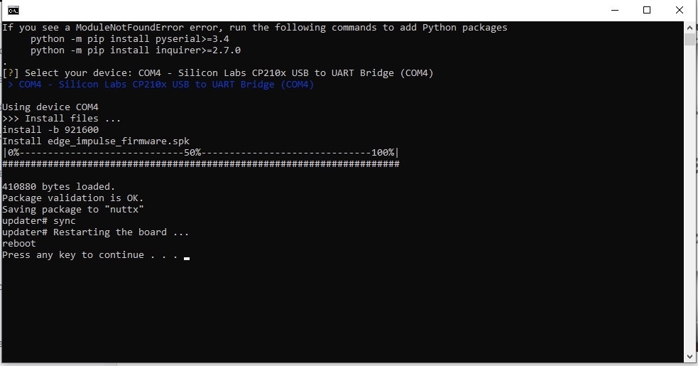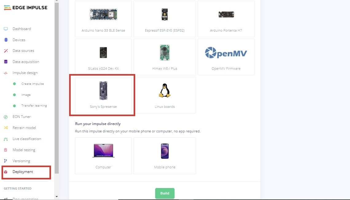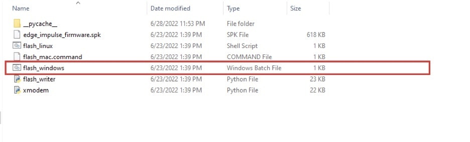In order to deploy a model on a microcontroller we must build firmware using the Edge Impulse platform. Figure 8 represents the steps for the Sony Spresense with red bounding boxes. Impulses can be deployed as a C++ library and included in your own application, or full firmware with the model included can be downloaded. Choosing the firmware version, a Zip file is created and a download is generated. After downloading, unzip the file, as shown in Figure 9. Click on theflash command that corresponds to your operating system. In my case, this was Windows.