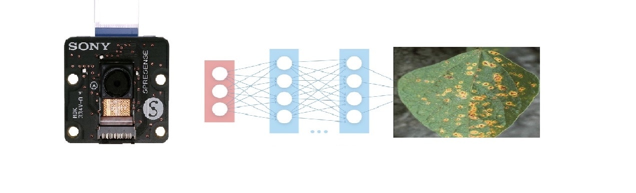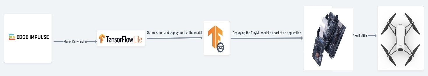 The Sony Spresense main board, Extension board, Spresense camera, a USB-micro cable, and UAVs were used in this project. The Sony Spresense is a small, but powerful development board with a 6 core Cortex-M4F microcontroller and integrated GPS, and a wide variety of add-on modules including an extension board with headphone jack, SD card slot and microphone pins, a camera board, a sensor board with accelerometer, pressure, and geomagnetism sensors, and Wi-Fi board - and it’s fully supported by Edge Impulse [2]. Drones, in the form of both Remotely Piloted Aerial Systems (RPAS) and unmanned aerial vehicles (UAV), are increasingly being used to revolutionize many existing applications. The Internet of Things (IoT) is becoming more ubiquitous every day, thanks to the widespread adoption and integration of mobile robots into IoT ecosystems [3]. As a basis for the development of our autonomous system, the DJI Tello was chosen due to its easy programmability and wide availability. The Tello drone [4] has a maximum flight time of up to 13 minutes, a weight of about 80 g (with propellers and battery), and dimensions of 98 mm x 92.5 mm x 41 mm. It mounts 3-inch propellers and has a built-in WIFI 802.11n 2.4ghz module. As for the TinyML platform, the Sony Spresense microcontroller [5] was chosen, which acted as a decision unit shown in Figure 2. The platform is a small, low power microcontroller that enables the easy and intuitive implementation of image processing applications. It can be programmed using high-level Python scripts (MicroPython).