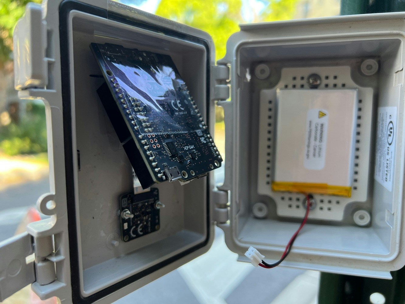 Sony was nice enough to send me one of their Spresense development boards, along with the LTE Extension board and camera to use for this project. My judgment may have been a little bit swayed because the board was free, but I have to say it really is a pleasure to use. To start with, the LTE-M Extension board is amazing and easy to work with. With the included libraries, it’s very easy to send out MQTT messages or TCP/IP traffic right from the dev board. Another thing this board has going for it is the camera. Sony has a lot of experience building image sensors and it shows. The auto white balance and auto exposure were spot on - allowing it to handle a wide range of lighting conditions with ease. I used the camera from sun up to sundown and it managed to get shots the whole time. There is also hardware accelerated support for common image tasks, like clipping and resizing. The board also has phenomenal audio capabilities - I didn’t get to use them for this project but I’m looking forward to trying them out in some future builds. Another feature I didn’t get to put to use was the boards multiple cores. Sony has provided libraries that make it easy to run independent programs on each of the five sub cores and the main core. Of course no dev board is perfect - While there is a breakout connection for line-power, neither the dev board or extension board come with a connector for hooking up a LiPo battery. The documentation recommends just using a USB battery instead, but I was unable to easily fit that into the case I was using. I did solder on a JST connector and was able to add a LiPo battery and power it. However, unlike the Adafruit boards that I am used to, this board does not provide any way to charge for the battery. I am planning on eventually adding solar charging so this isn’t a big problem.