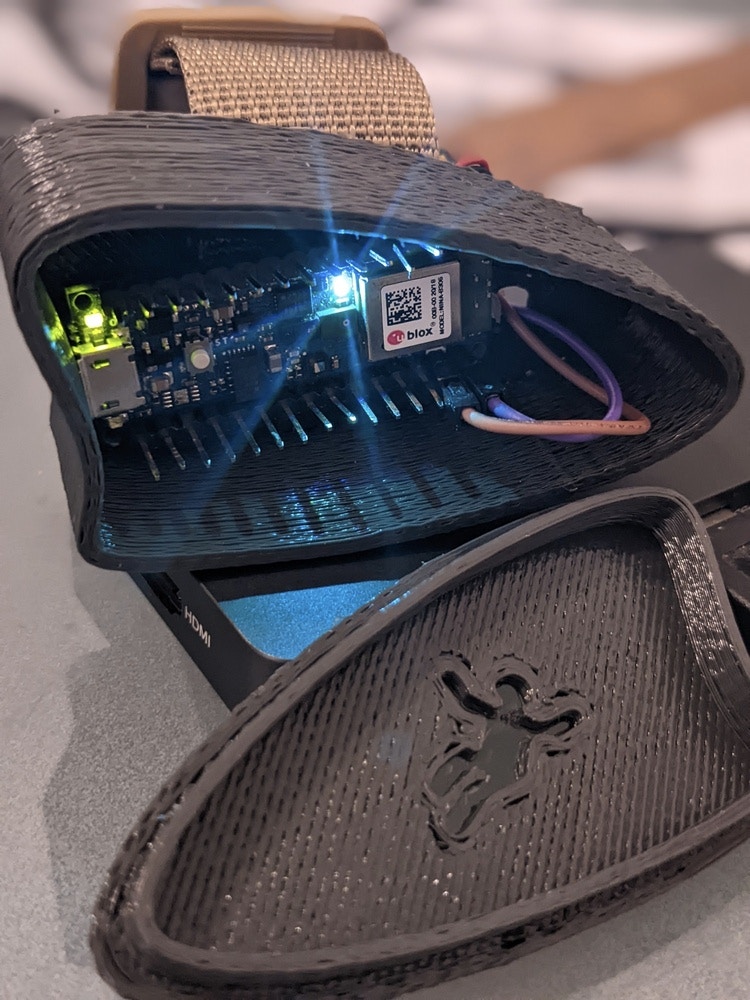 The electronics part of the client build is easy: just a battery, a TP4056 and the Arduino Nano 33 BLE Sense. The board has an onboard accelerometer, onboard RGB led, and enough processing power to run an Edge Impulse library for inferencing locally.
