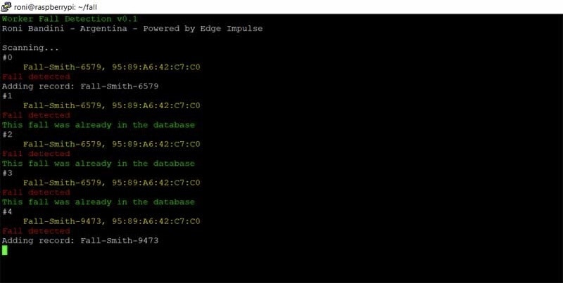 Each worker has a small TinyML device in charge of detecting falls via the onboard accelerometer data, and reporting to a server through Bluetooth. The server is a Raspberry Pi running a Python script that scans specific BT announcements, parses the fall alert information, and stores it into a SQL Lite database for reports and alerts.Client Devices