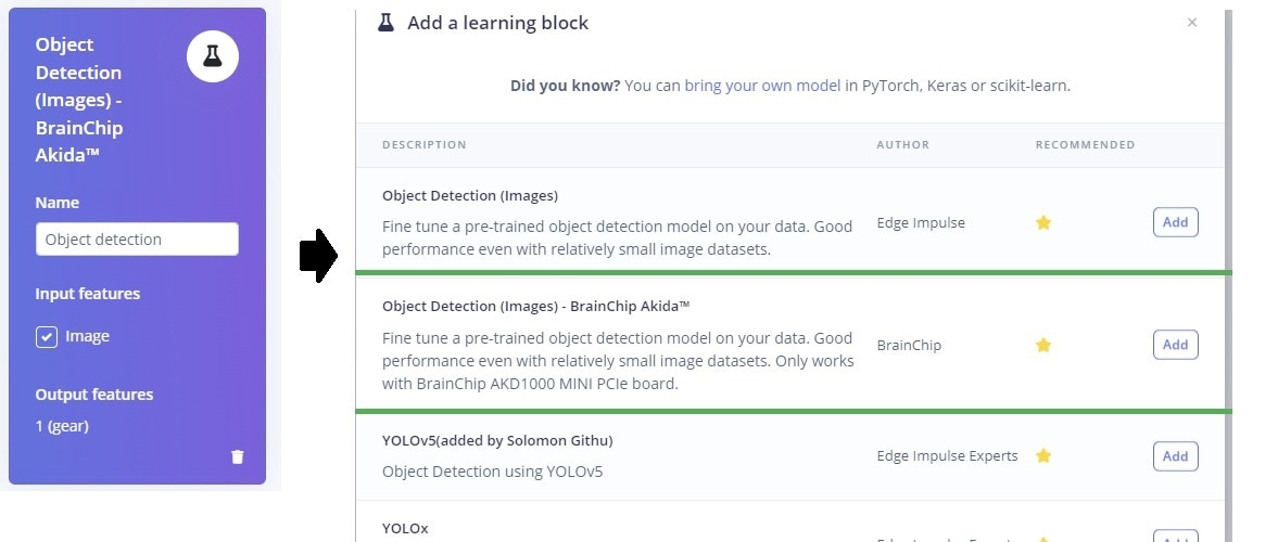 For an industrial automation engineer, or anyone not familiar with deep learning, this can seem daunting and slows down the efficacy of deploying AI-based inspection systems. The fastest path to market in the past has been expensive proprietary camera hardware and software solutions that abstract the process with complicated licensing, and limited access to the underlying platform. However, the Brainchip Akida acts as a co-processor, enabling you to use your existing x86 or Arm-based platform to have full freedom on your final application. From the software perspective, Edge Impulse eliminates that complexity and cost and provides a solution that offers a flexible way to collect data using the Brainchip hardware, or any other device with a camera, even your mobile phone. The process of building the ML model is intuitive and straight-forward, and thanks to Edge Impulse’s built in support for the Akida AKD1000, Edge Impulse generates a model that is optimized and performs the Akida workflow for you automatically in the background, with the result being either a.fbz model or Edge Impulse’s extremely useful .eim executable model format.