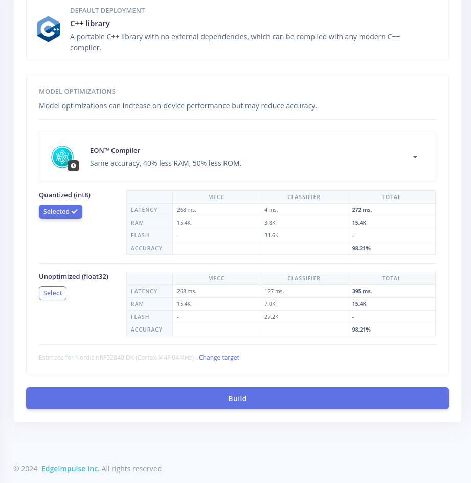 Once your Impulse is designed, trained, and verified, you can deploy it to your device for offline operation, reduced latency, and low power consumption. Edge Impulse allows you to package the entire Impulse into a C++ library for your embedded software. To export, go to the Deployment menu, select your development board, and click Build.