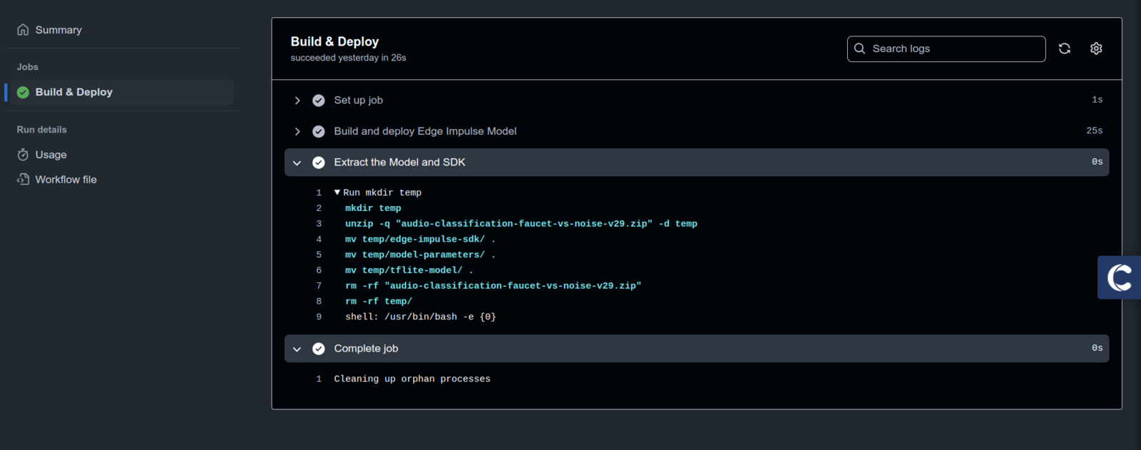 edgeimpulse/build-deploy@v1 action to automate the build and deployment of your Edge Impulse model. Make sure to use your GitHub secrets for the project_id and api_key.