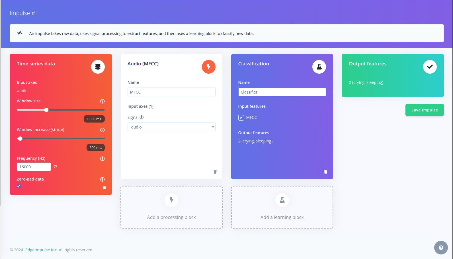 An impulse in Edge Impulse defines the end-to-end processing pipeline for your data—from raw input to classification. In this step, we design an impulse tailored for audio data to distinguish between baby crying and sleeping sounds. The impulse includes the configuration of audio data as time-series input, feature extraction using MFCC (Mel-Frequency Cepstral Coefficients), and classification using a machine learning block.Steps to Create an Impulse: