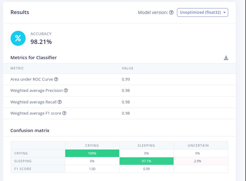 MFCC) and link the Input Axes toaudio. - MFCC transforms the raw audio into a spectrogram-like representation that captures key features for audio classification, making it effective for distinguishing sounds like crying and sleeping.