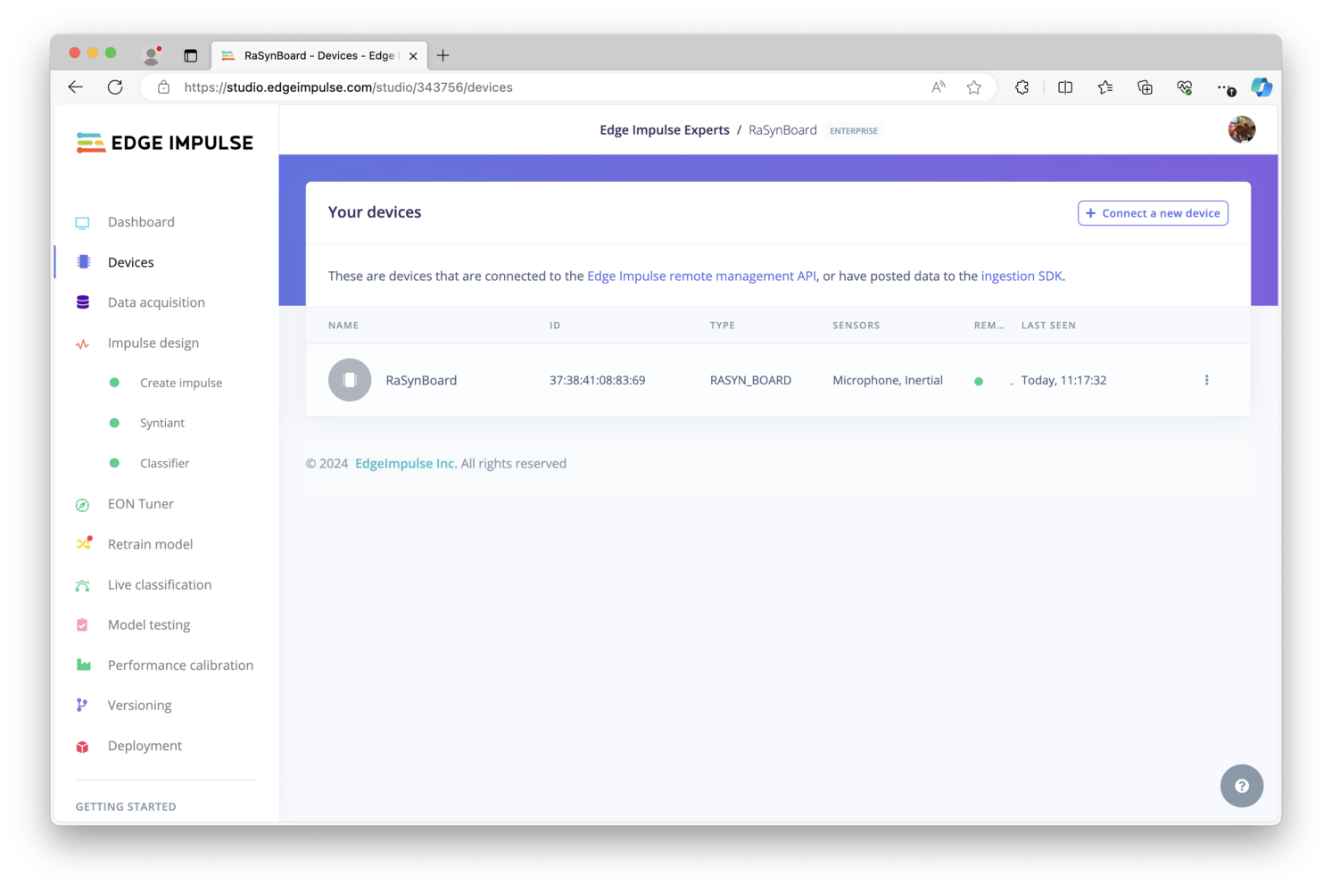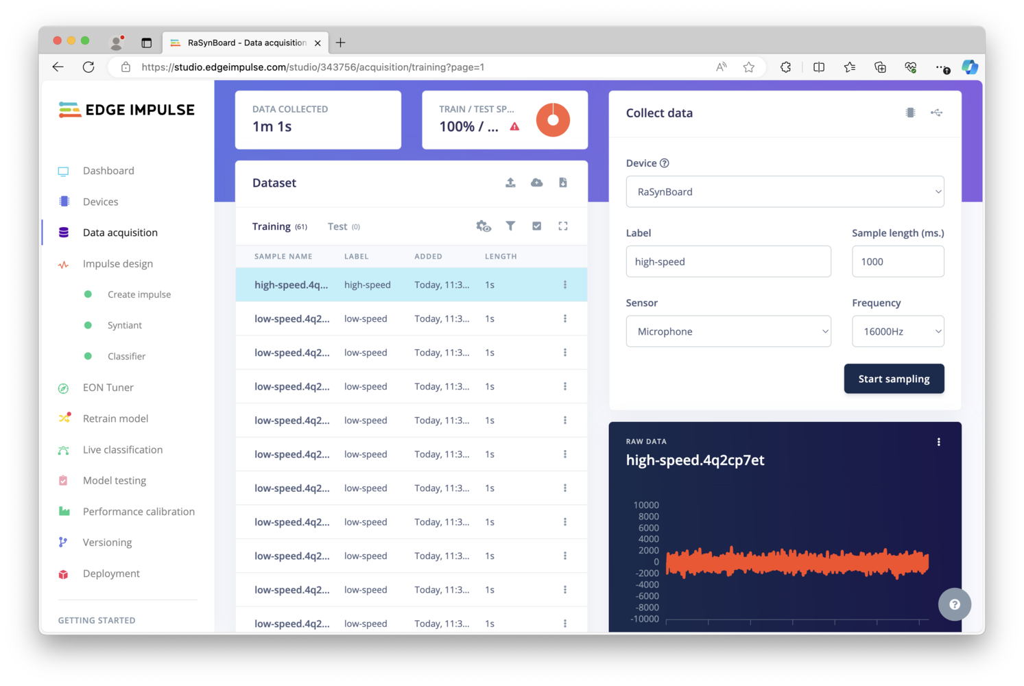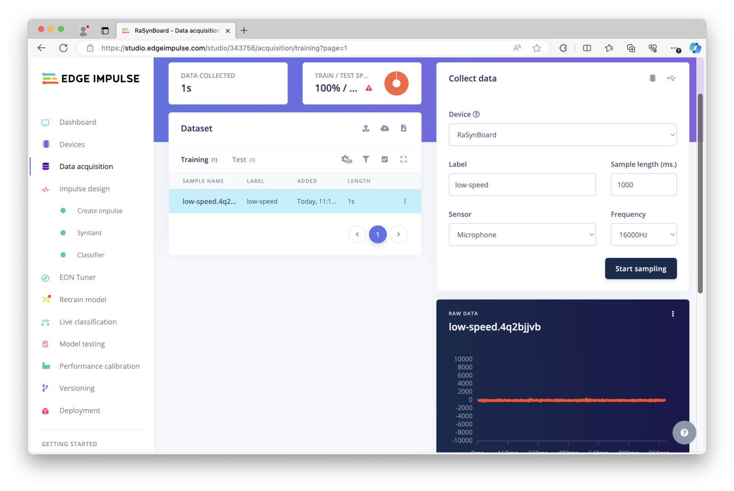 Now that the RaSynBoard is running Edge Impulse firmware, you can use theedge-impulse-daemon command (which got installed as part of the CLI installation) on your desktop or laptop to connect the RaSynBoard to Edge Impulse. The board will then show up in the “Devices” page, and over on the Data Acquisition page you can use the drop-down menus to choose your device, choose the Microphone, enter a sample length of 1000 milliseconds (1 second), and provide a label for the type of data you are collecting. Once ready you will simply click “Start sampling”. (The IMU is also available, for projects that might make us of accelerometer data).