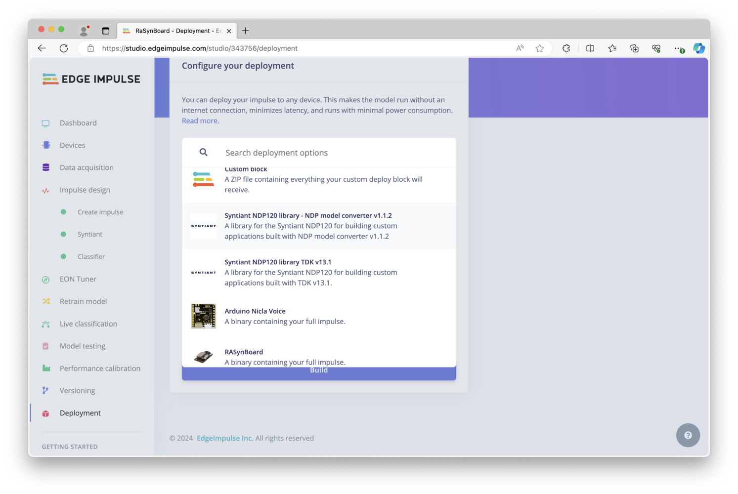 To deploy this newly-built audio classification machine learning model onto the RaSynBoard, there are a few options. The quickest way to test if your model is functional and determine accuracy in the real world, is to simply choose a ready-made firmware binary that can be flashed and run immediately on the RaSynBoard. However, when building a full-featured application intended for production use, you’ll instead want to choose either the Syntiant NDP120 library or Custom Block export options, as you can then leverage the machine learning model in your application code as necessary, depending on your use-case or product.