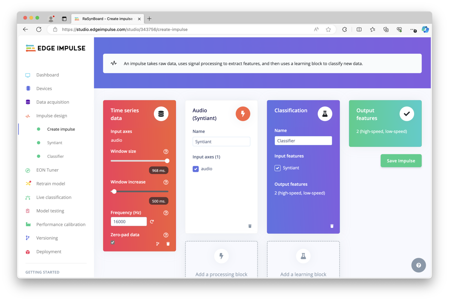 Once a dataset has been collected, a machine learning model can be built that identifies or recognizes these same sounds in the field. So in this project, we should be able to identify and classify the sound of our pump running at low-speed, and the sound of our pump running at high-speed. On the left, click on “Impulse design”, and in the first block, “Time Series Data” should already be selected. Add a Processing block, and choose Audio (Syntiant). Then add a Learning block, and choose Classification. Finally, the Output features should already be selected, thus you can click Save Impulse.