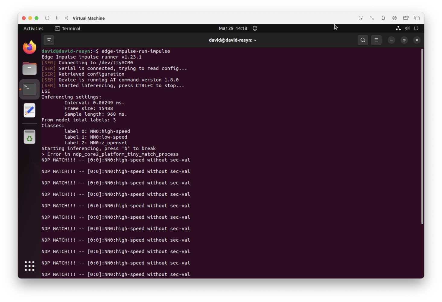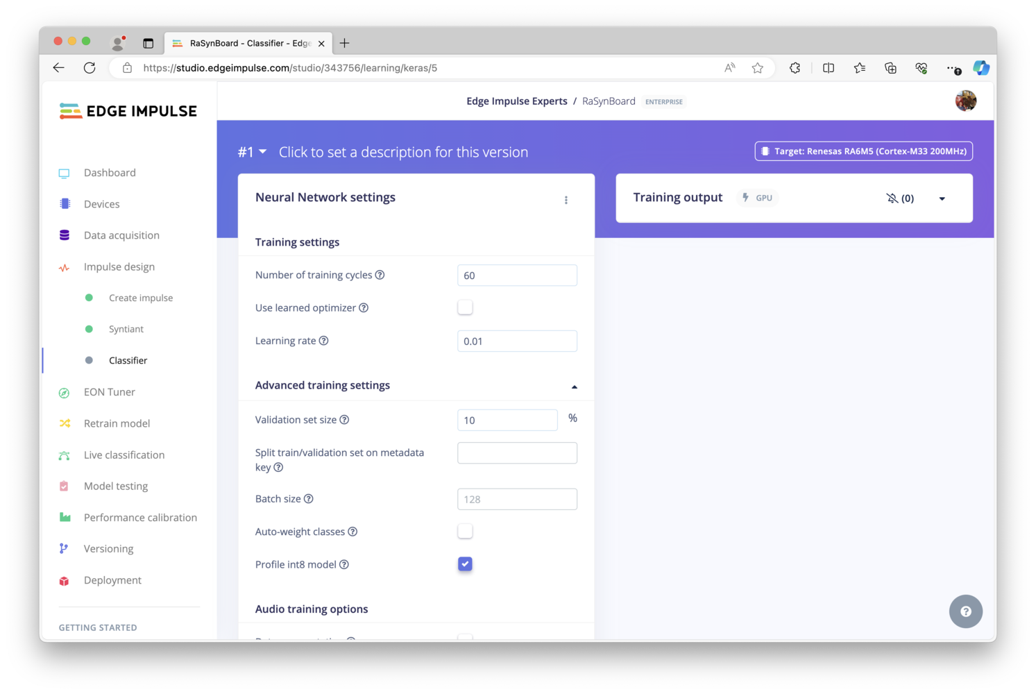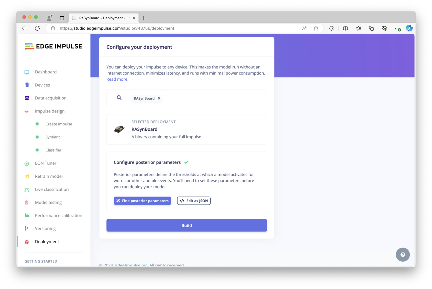 The RaSynBoard comes with default firmware from Avnet out-of-the-box, so that it is ready to use and quick to get started with machine learning exploration. But we’ll need to add Edge Impulse firmware to the board instead, in order to interface with the Edge Impulse Studio or API. To flash the board with the necessary firmware, you will need two Renesas flashing applications installed, as well as the Edge Impulse CLI. Links to the needed software, as well as the firmware that needs to be flashed, are located in the documentation here. Download and install each of the three applications, and download the firmware .zip file, and unzip it. Once you have the Renesas bits installed, and the firmware downloaded and extracted on your laptop or desktop, you can flash the RaSynBoard by removing the SD Card, removing the Jumper from pins 1-2, and then connecting a USB-C cable from your computer to the USB-C port on the I/O Board. This is shown in detail in the excellent Avnet documentation located here. With the board connected to the computer, inside the extracted .zip file, run theflash_linux.sh or flash_win.bat file depending upon whether you are on Linux or Windows, and the Edge Impulse firmware will be flashed to the board. When completed, you can disconnect the RaSynBoard from the computer.
