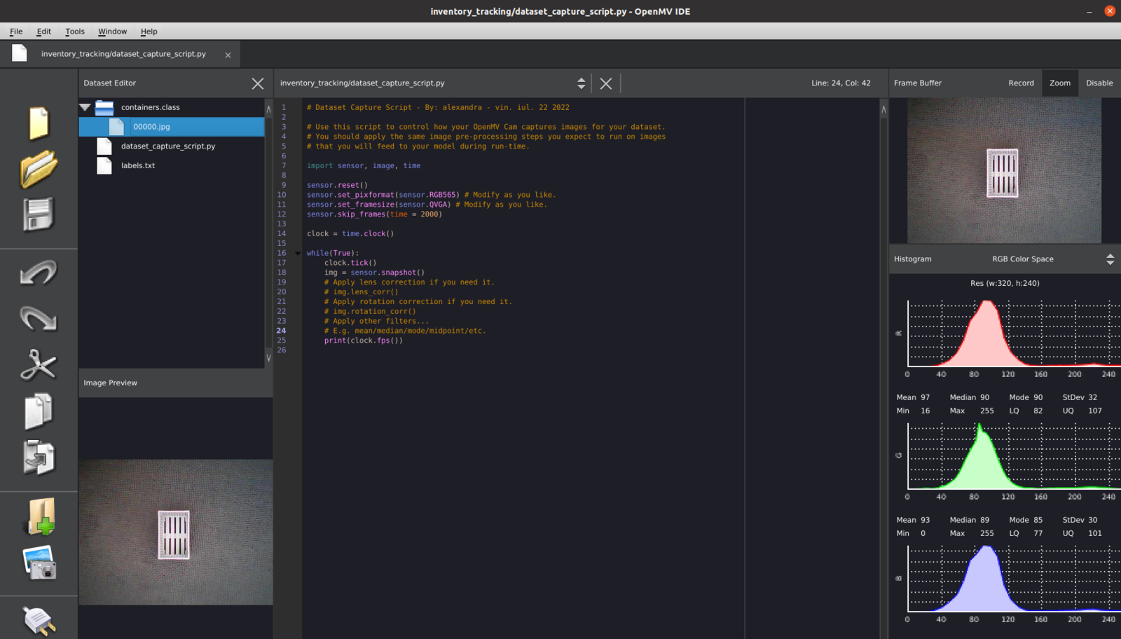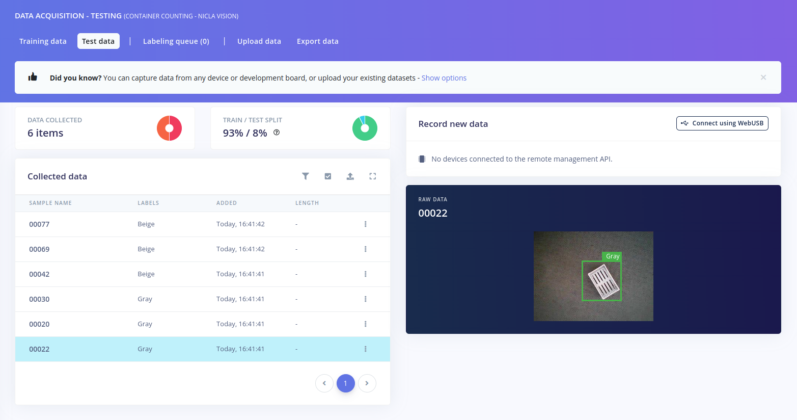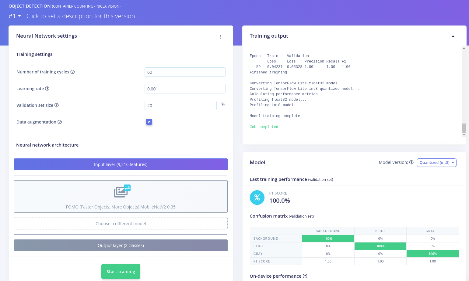 First, we must gather some images to train the model. We’ve used two types of containers, so we’ll define two corresponding classes (Gray and Beige). If your containers come in all sorts of sizes and colors you could go for adding a marker on them and training the model to recognize the marker rather than the entire container. Connect the Nicla Vision board to your laptop, go to OpenMV and click on the Connect button in the bottom left corner. If you cannot connect the board from the first try, double click the button on the Nicla Vision to put the board into bootloader mode (the green LED should be blinking). Then go to Tools -> Dataset Editor -> New Dataset and choose a folder where you want to save the images. Click on New Class Folder and give it a name, do this for each class. Select the class by clicking on it and then click on the image button under New Class Folder to capture an image. Rotate the container each time you take a picture to make sure you capture all the possible angles. You can take around 40 pictures for each class.