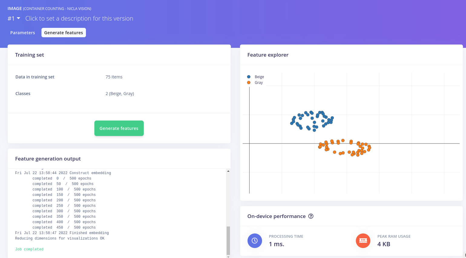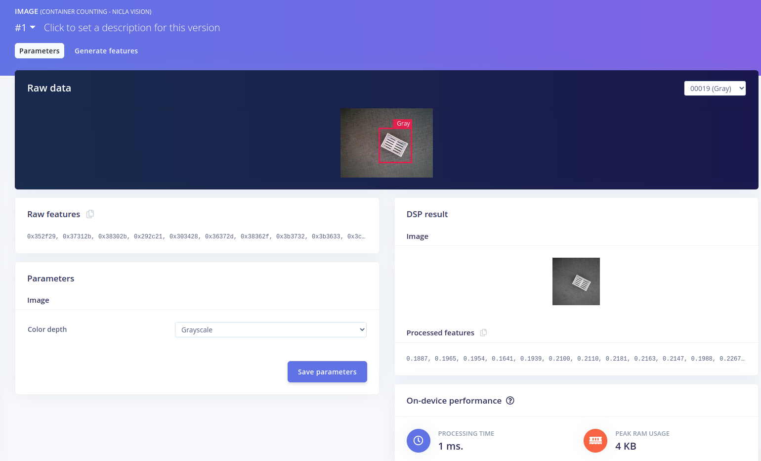 Now go to the Image menu in the Impulse Design menu. Select Grayscale as the Color depth (the FOMO algorithm only works with this option, not RGB) and click on Save Parameters and Generate Features. This will resize all the images to 96x96px and change the color depth of the images. You’ll also be able to visualize the generated features in the Feature Explorer, clustered based on similarity. A good rule of thumb is that clusters that are well separated in the feature explorer will be easier to learn for the machine learning model.