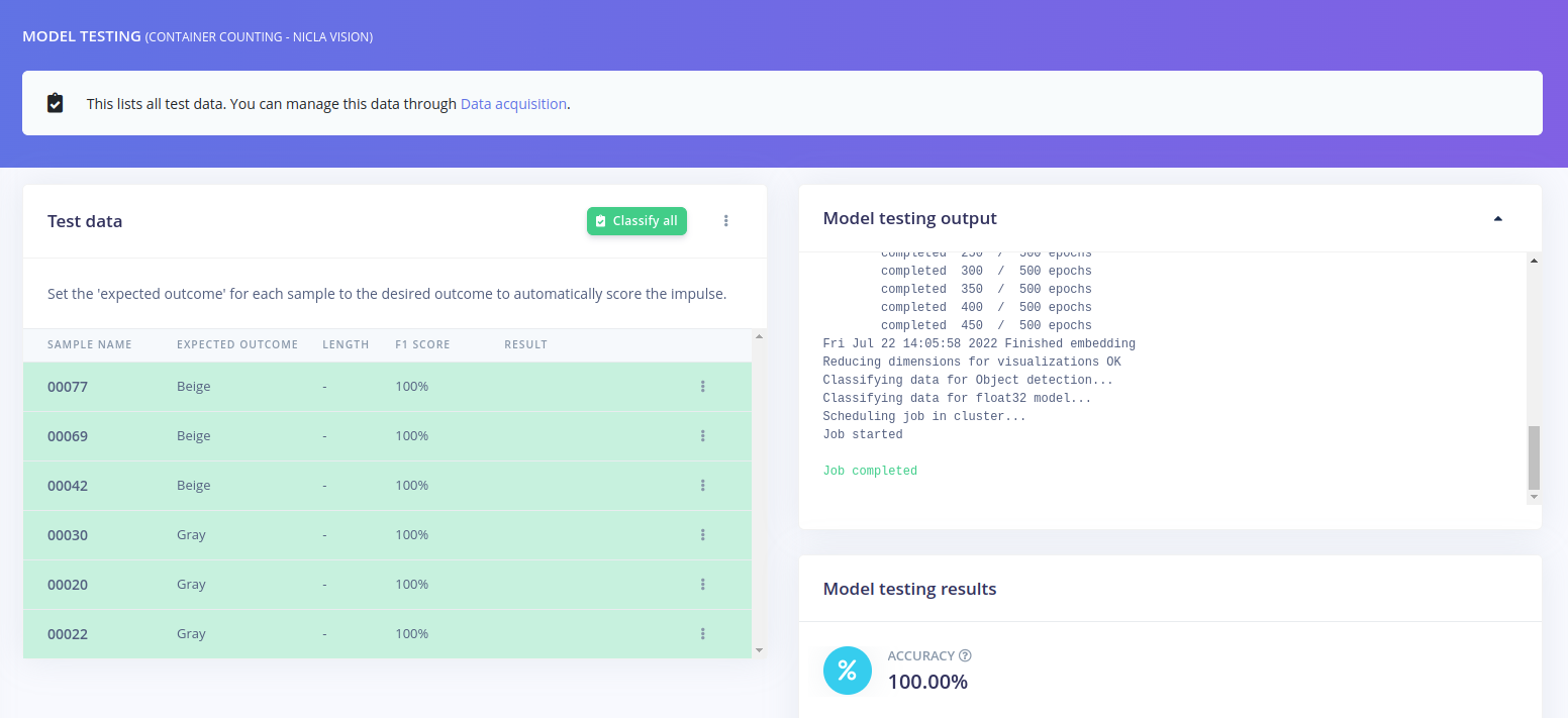 To test the model, go to Model testing and select Test all. The model will classify all of the test set samples and provide you with an overall accuracy score for the model.