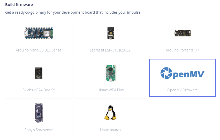 We’ve created, trained, and validated our model, so now it’s time to deploy it to the Nicla Vision Board. Go to Deployment in the Edge Impulse menu, select OpenMV Firmware and click on the Build button at the bottom of the page. This will generate an OpenMV firmware and download it as a ZIP file. Unzip it and you’ll find inside several files including edge_impulse_firmware_arduino_nicla_vision.bin and ei_object_detection.py, which we are interested in.