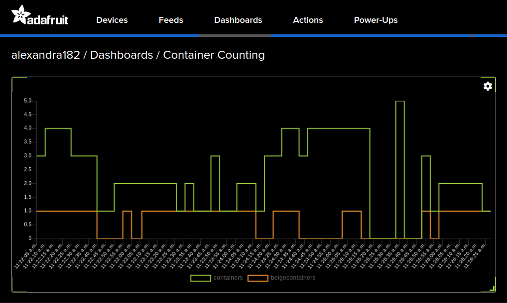 Adafruit IO is a cloud-based platform that allows you to easily interact with embedded devices. For example, you can use Adafruit IO to collect data from sensors and control actuators in real-time. You can also use Adafruit IO to create interactive interfaces, such as dashboards and data visualizations. It is easy to get started with Adafruit IO, and there is a large community of users who can provide support. In addition, Adafruit IO is compatible with a wide range of hardware platforms, making it a versatile tool for IoT applications. For this use case, we’ve used Adafruit IO to visualize the number of detected containers in real-time, through a Dashboard. To do this, first go to io.adafruit.com and define a feed for each detected class.