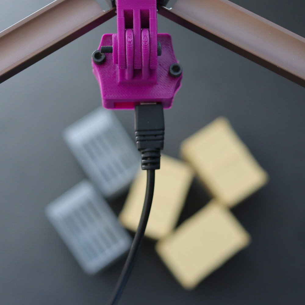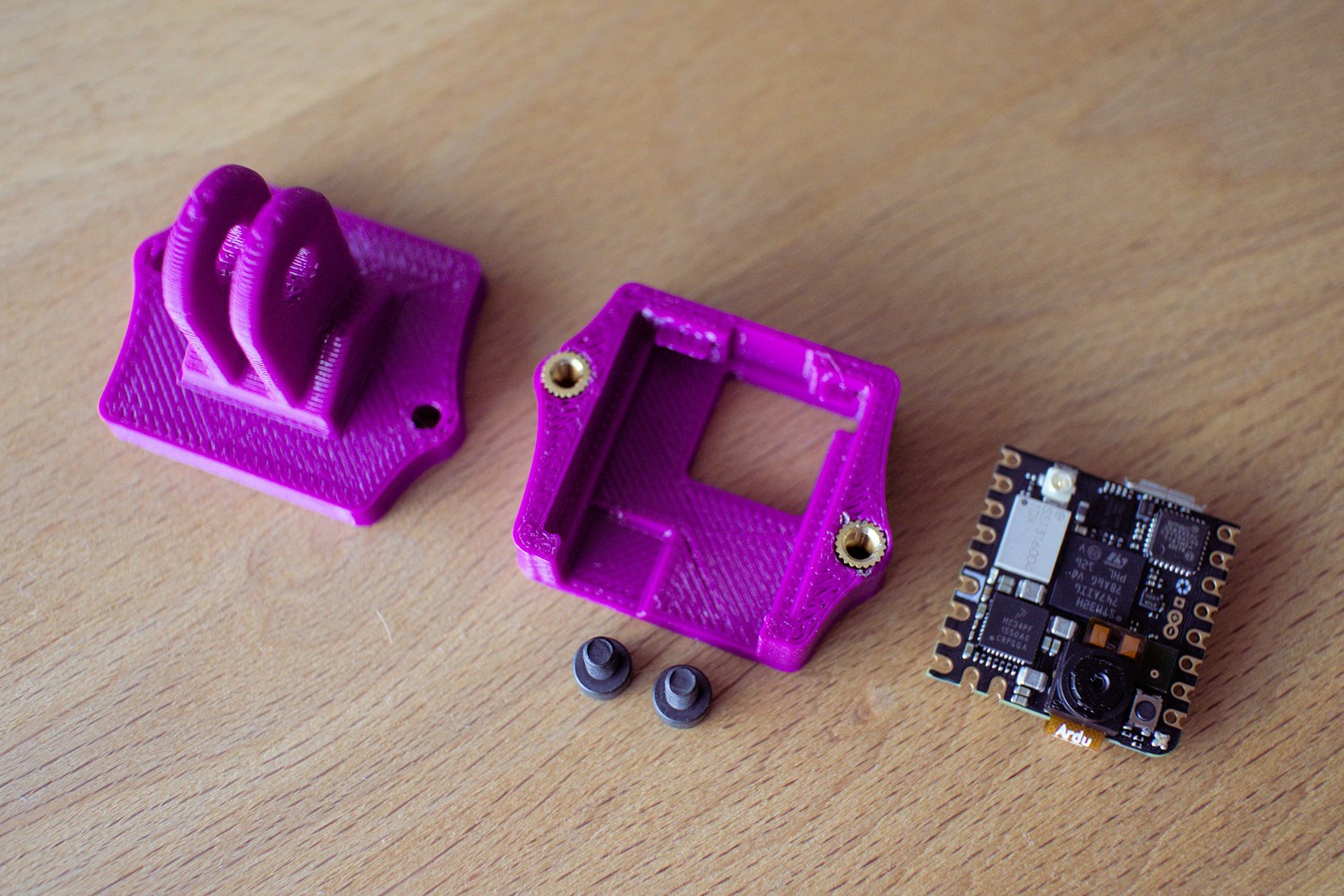 We’ve 3D printed an enclosure for the Arduino Nicla Vision board (you can download it from here) and mounted it at a high enough point to get a bird’s-eye view that captures all the important objects from the scene (the entire storing area and the containers on it). The case provides an extra layer of protection against environmental factors. The lid is secured by using M3 bolts and threaded inserts that were placed inside the base piece using a soldering iron. This ensures a good fit of the lid over the base piece and allows the case to be opened and closed repeatedly without having to worry about damaging a 3D printed thread. Moreover, we have opted to use a GoPro mount on the lid, a common pick in the open-source hardware community, that makes this design compatible with numerous other mounts available online that will fit your application.