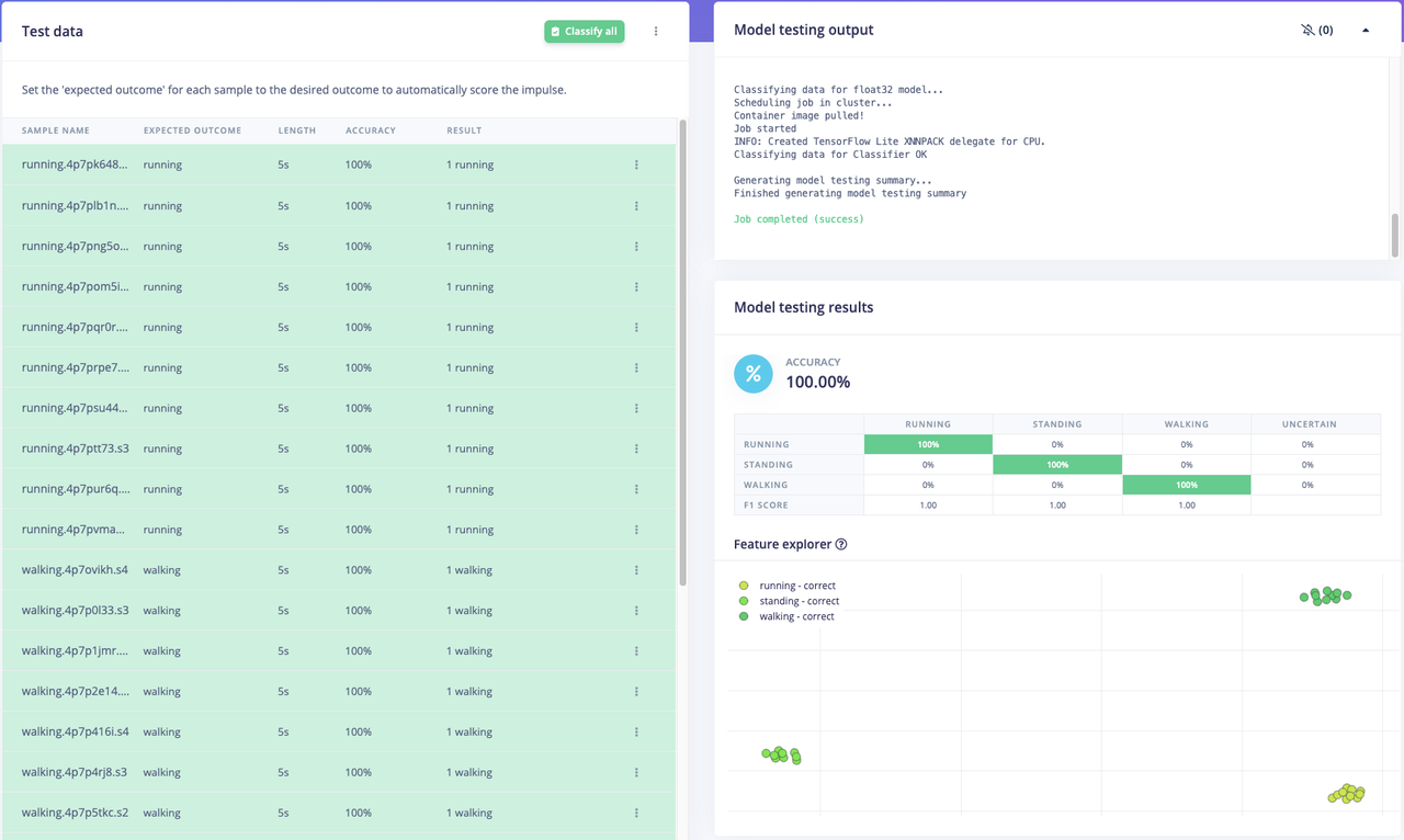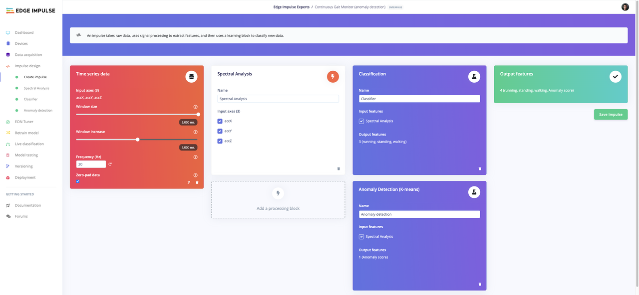 After thorough testing, including using the EON Tuner, the optimal settings for our time series data were determined. We employ both a classifier and K-means anomaly detection to enable both gait pattern classification and anomaly scoring.