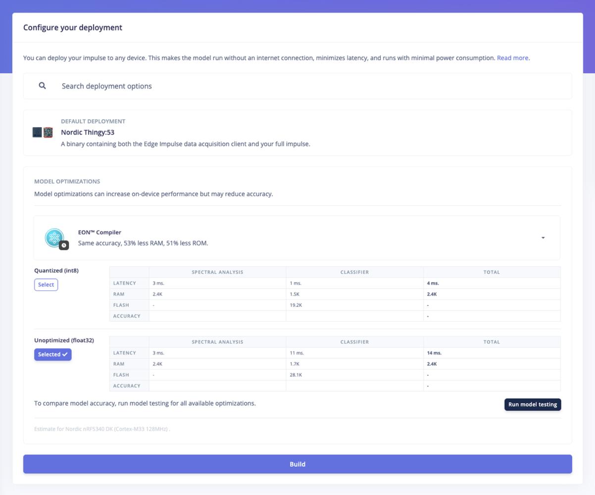 Now the AI model is ready to be deployed to the Edge. Nordic Thingy:53 is selected for our deployment option. For this project we chose unoptimized (float32) to preserve accuracy since our hardware has enough performance and memory headroom.