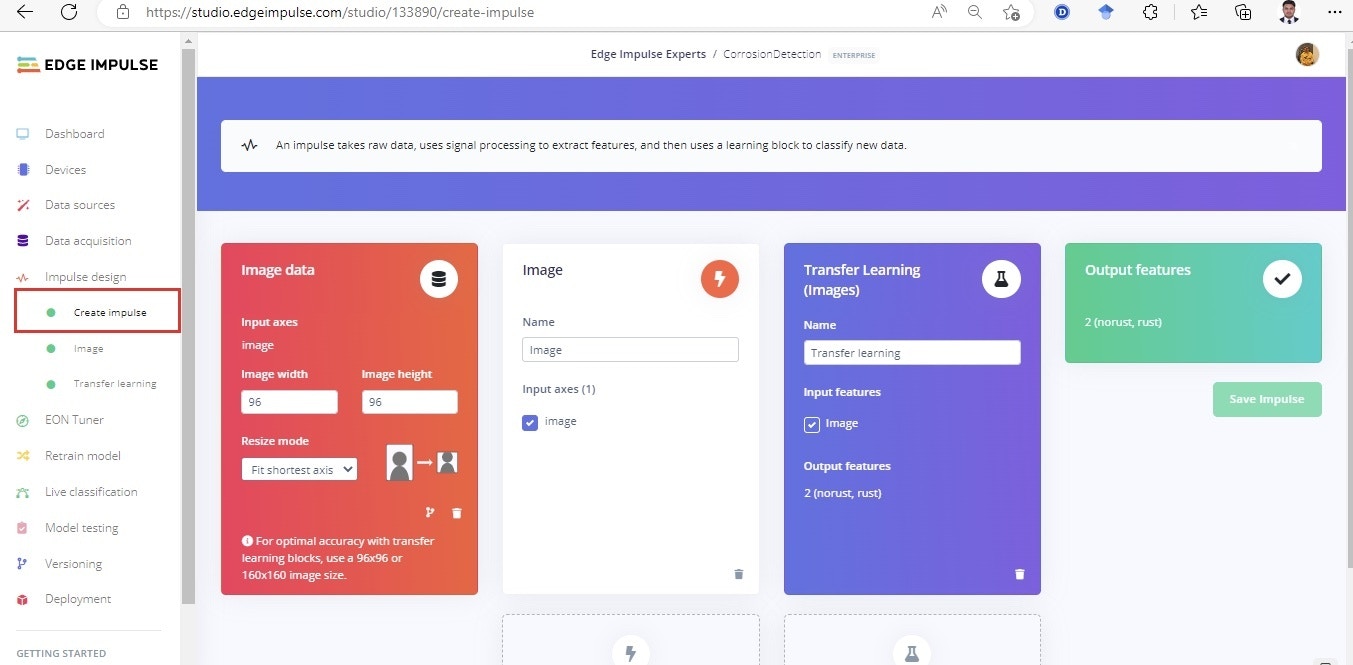 Once the dataset is uploaded, we are ready to train our model. This requires two important features: a processing block and a learning block. Documentation on Impulse Design can be found here. We first click “Create Impulse”. Here, set image width and height to 96x96; and Resize mode to Squash. The Processing block is set to “Image” and the Learning block is “Transfer Learning (Images)”. Click ‘Save Impulse’ to use this configuration as shown in below figure. We have used a 96x96 image size to lower the RAM usage, presented in [3]. Higher resolution images will cause a subsequent increase in RAM usage when running the model.
