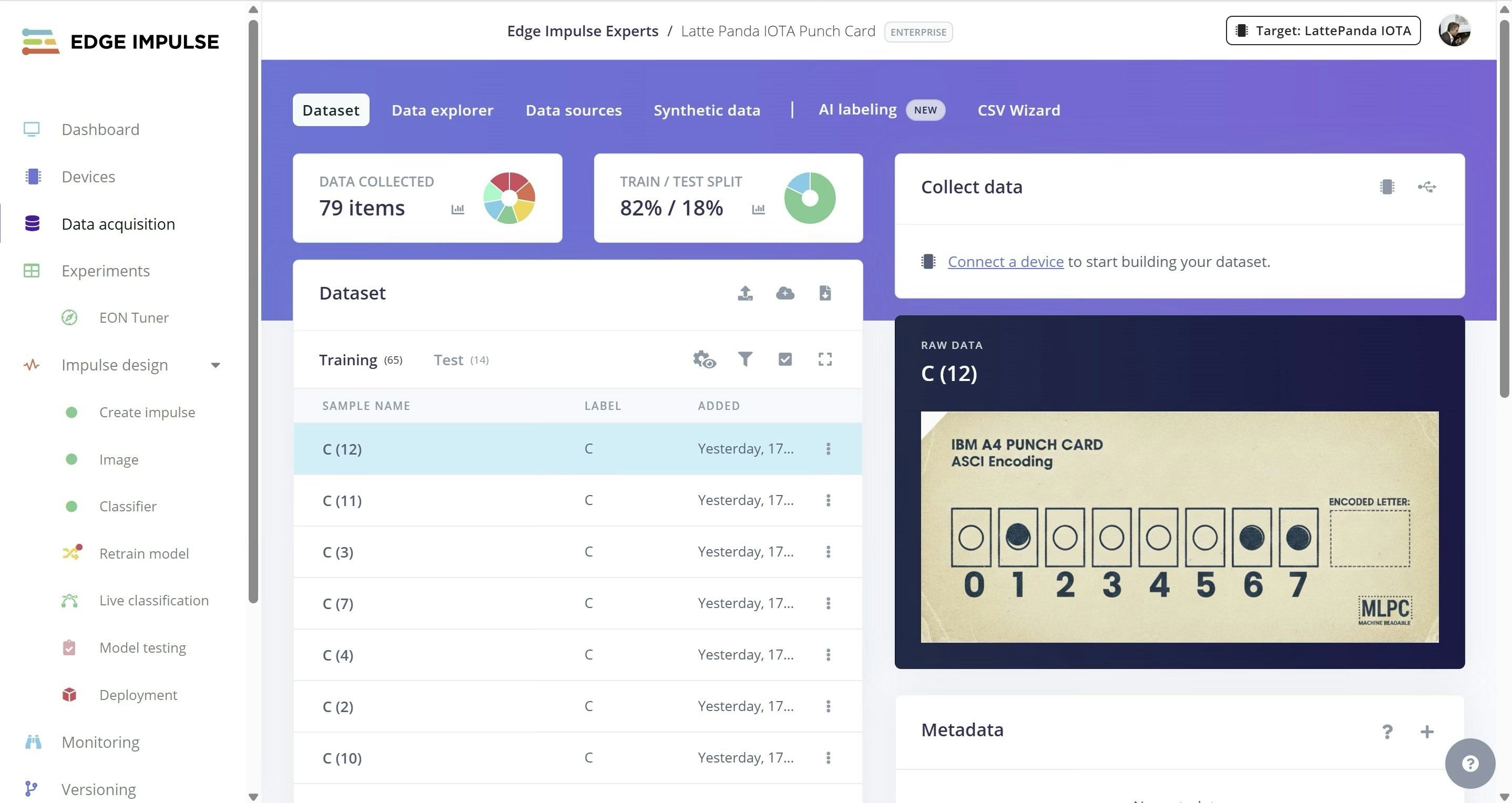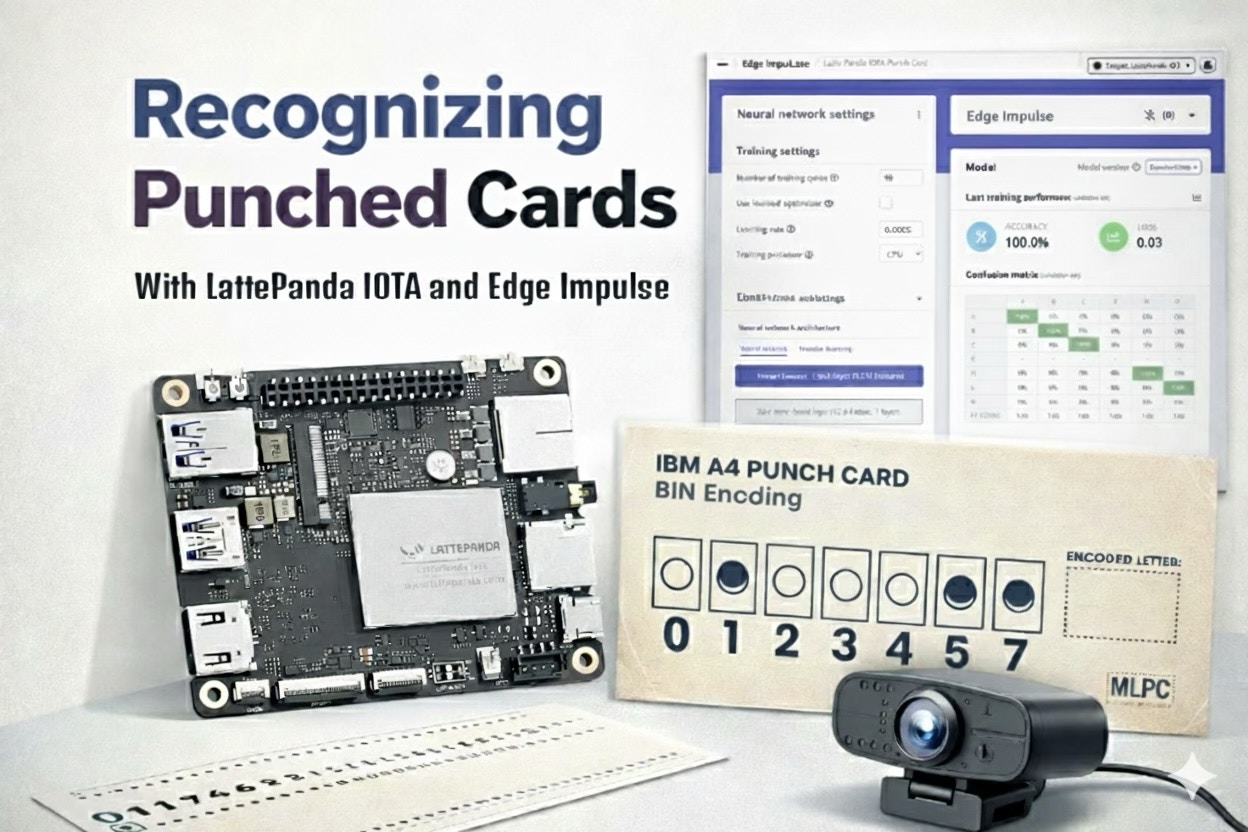 In 1804, Joseph Marie Jacquard demonstrated a mechanism to automate loom operation using a sequence of punched cards. Each card mechanically defined which warp threads were lifted for that pass, enabling programmable weaving patterns. This established the first industrial use of binary logic (hole or no hole) for machine control. Punched cards evolved from this mechanical origin, into a standardized data storage medium for computing. While the Jacquard loom used physical needles to sense holes, later systems like the 1890 Hollerith tabulator introduced electrical sensing, using spring-loaded pins to complete circuits through the perforations. This technology eventually culminated in the IBM 80-column / 12-row format (standardized in 1928), where card readers detected electrical continuity via wire brushes, or in later decades, utilized optical sensors to read data at high speeds. As a tribute to this technology and to test the LattePanda IOTA mini PC, this project recognizes visually “punched” cards — printed and tagged here instead of punched — using a camera and machine learning.Hardware