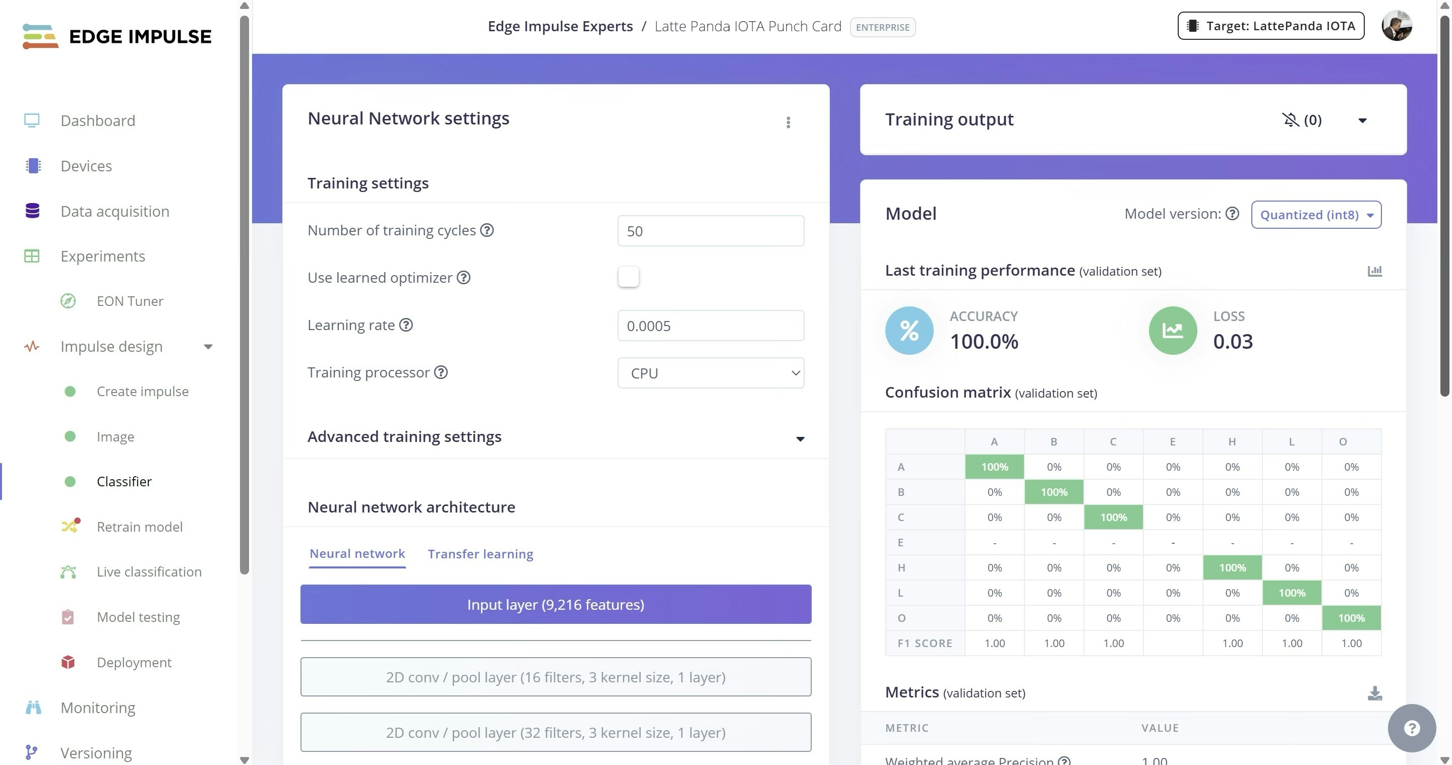 Log in, select the Edge Impulse project (if you have more than 1), and inference output begins immediately.