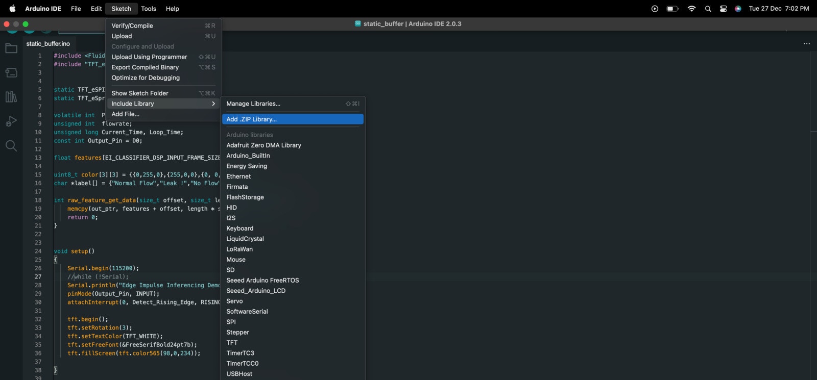 .zip file that contains our model and a set of examples. To use this library on the Arduino platform, we will need to add it to the Arduino Integrated Development Environment (IDE).