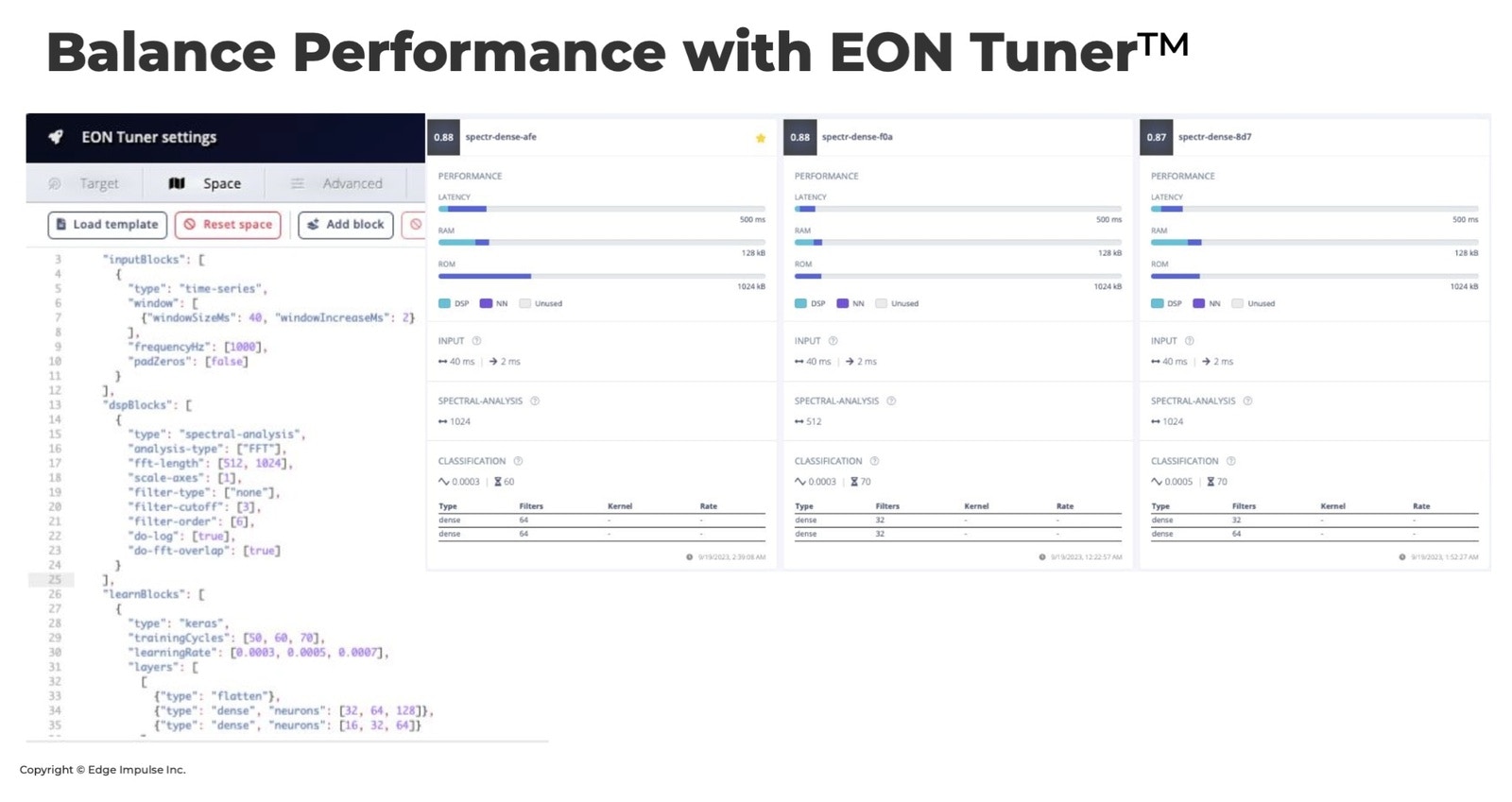 Once the model is built, it’s time to optimize, and determine what (if any) parameters need to be changed or adjusted in the pipeline. That’s where the EON (Edge Optimized Neural) Tuner comes into play. The scientific method requires changing one control variable at a time, but that can be time-consuming when optimizing entire machine learning pipelines. Additionally, the feature extraction and training jobs could take hours. With EON Tuner that hyperparameter search is done in parallel, starting all of the possible combinations at once and then comparing all of the results side-by-side, then sorting by whichever figures of merit were most important to the application.