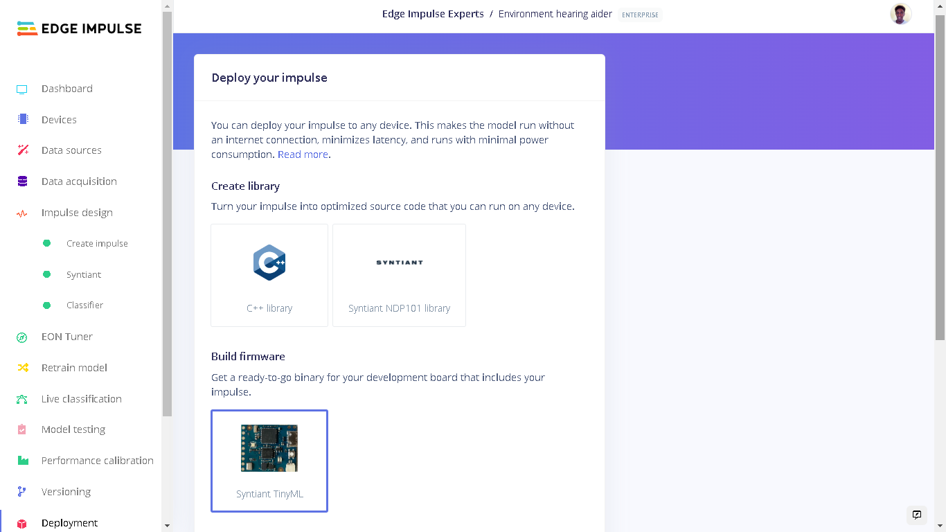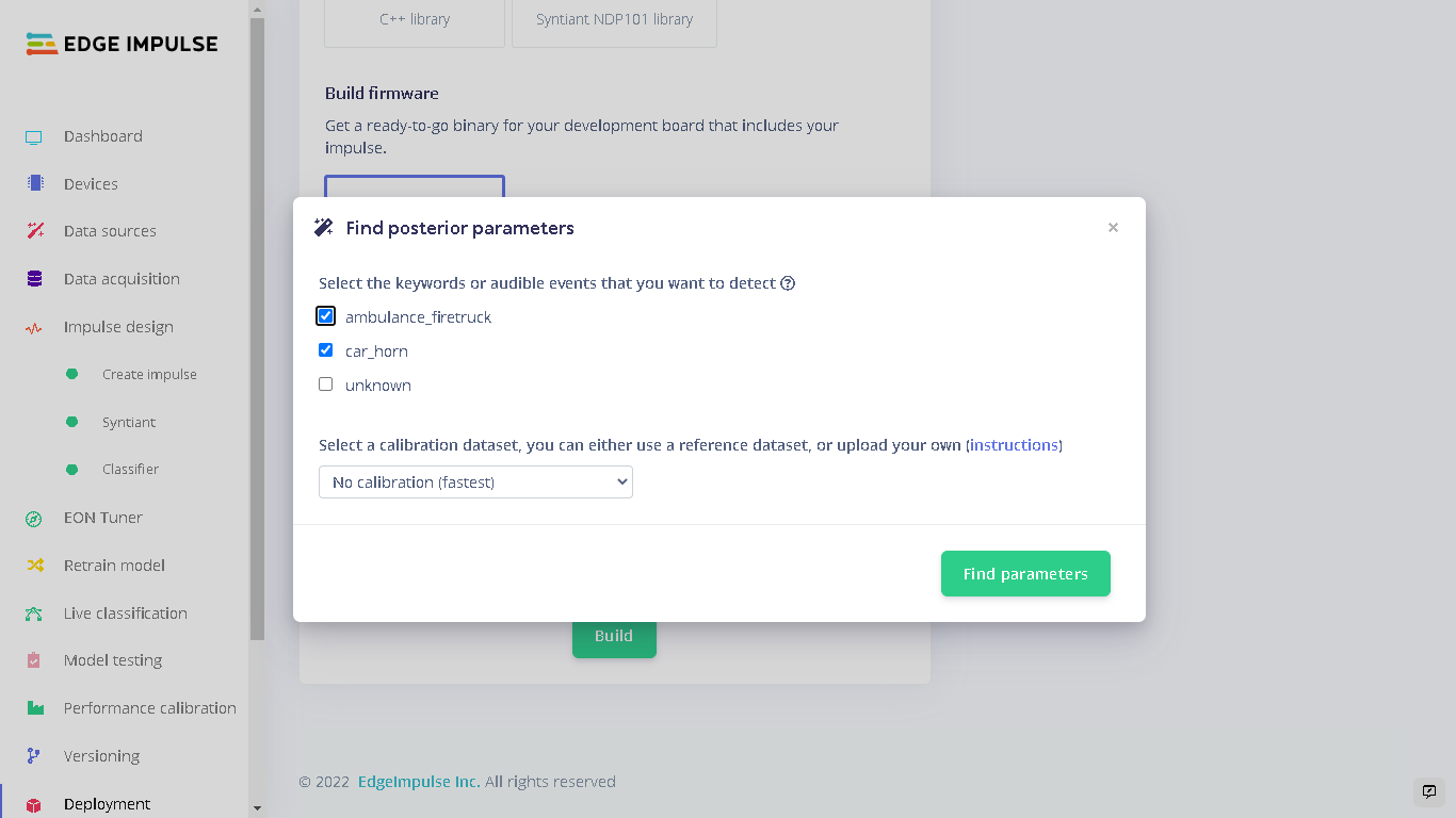 To deploy our model to the Syntiant Board, first click “Deployment” on the left side panel. Here, we will first deploy our model as a firmware for the board. When our audible events: ambulance_firetruck and car_horn are detected, the onboard RGB LED will turn on. When the “unknown” sounds are detected, the onboard RGB LED will be off. This firmware runs locally on the board without requiring internet connectivity and also with minimal power consumption. Under “Build Firmware” select Syntiant TinyML.