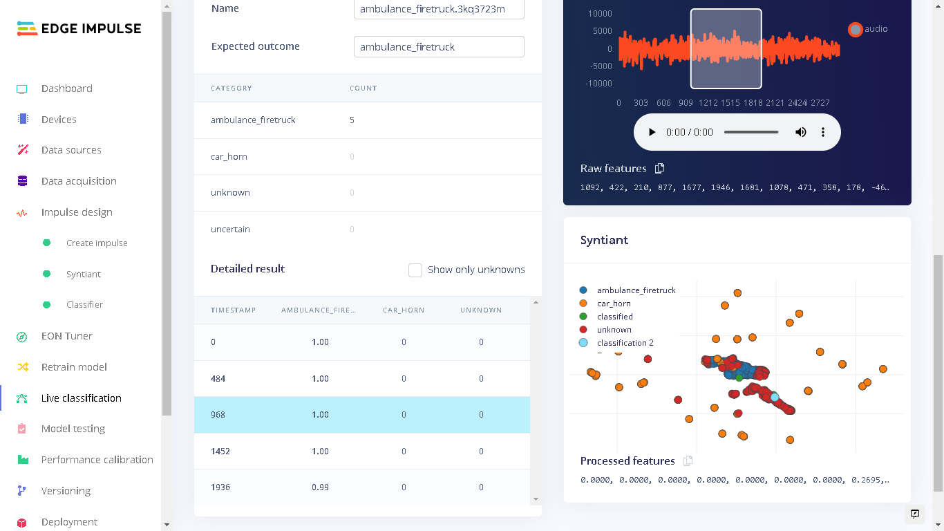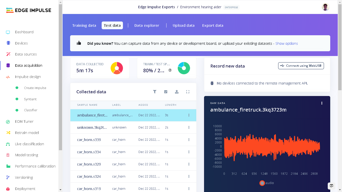 I first searched for open datasets of ambulance siren, firetruck siren, car horns and traffic sounds. I used the Kaggle dataset of Emergency Vehicle Siren Sounds and the Isolated urban sound database for the key sounds. From these datasets, I created the classes “ambulance_firetruck” and “car_horn”. In addition to the key events that I wanted to be detected, I also needed another class that is not part of them. I labelled this class as “unknown” and it has sounds of traffic, people speaking, machines, and vehicles, among others. Each class has 1 second of audio sounds. In total, I had 20 minutes of data for training and 5 minutes of data for testing. For part of the “unknown” class, I used Edge Impulse keywords dataset. From this dataset, I used the “noise” audio files.