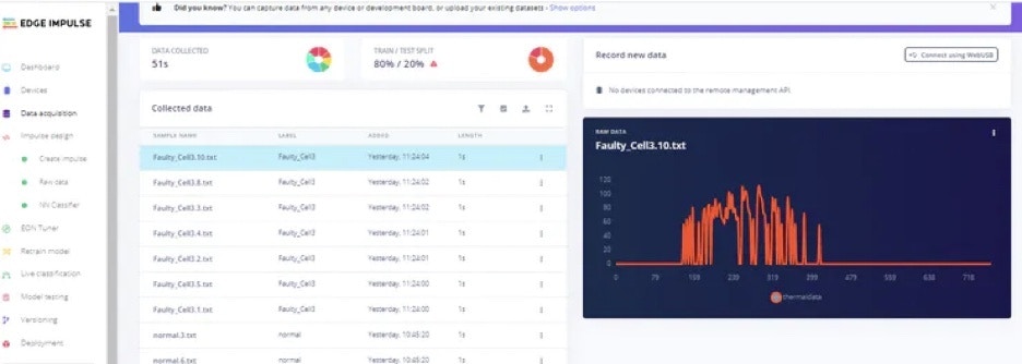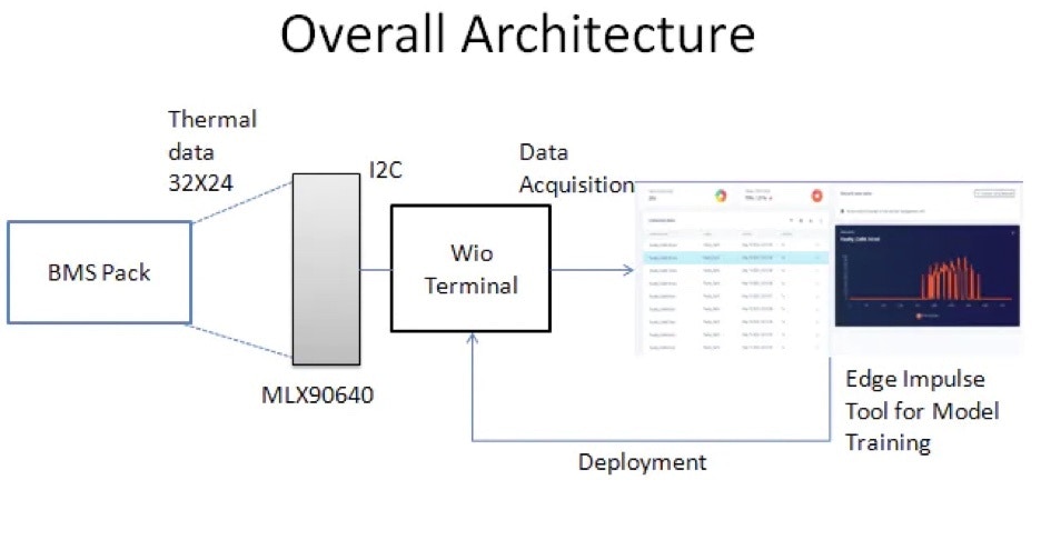 This prototype uses a Wio Terminal and Edge Impulse to predict overheated faulty cells in a BMS pack. For this project, I used an MLX 90640 Thermal Camera with the Wio Terminal to collect thermal data from a BMS pack. A working demo of my prototype is available on YouTube here:Problem Statement