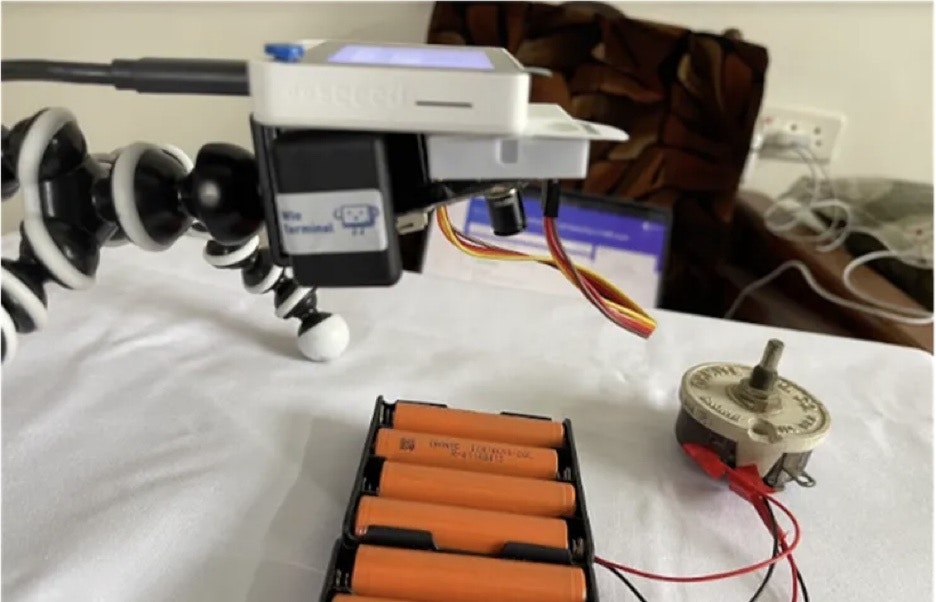 In this prototype, 6 lithium-ion cells are connected to the load (Rheostat) and the MLX90640 and Wio Terminal are attached to the stand where the MLX90640 thermal camera is facing downwards over the lithium-ion cells.