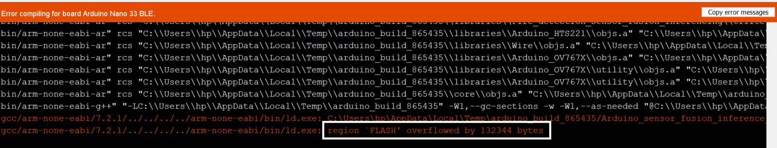 After the Arduino library has finished downloading, we can open the Arduino IDE and install the zipped library. Afterwards we open the inference Sketch in the Arduino IDE. Feel free to clone the GitHub repository or copy and paste the code to an Arduino Sketch on your computer. In the inference Sketch, we need to ensure that the variablesEI_CAMERA_RAW_FRAME_BUFFER_COLS, EI_CAMERA_RAW_FRAME_BUFFER_ROWS, WIDTH, and HEIGHT have the same image dimensions as the one used in the model training. Finally, we can upload the inference Sketch on the Arduino Nano 33 BLE Sense. Once the code is uploaded, the Arduino board will record the room temperature, capture an image, and then classify if the environment is safe or has a fire. The inference Sketch follows a similar operation as the data collection code. The main difference in this case is that the data are not printed to Serial. In fact, the inference Sketch is also built from the nano_33ble_sense_camera.ino example code. I updated the code to also get temperature value and then in the function ei_camera_cutout_get_data, we can append the temperature value to the buffer that will afterwards be passed to the classifier which in this case is our multi-input model.