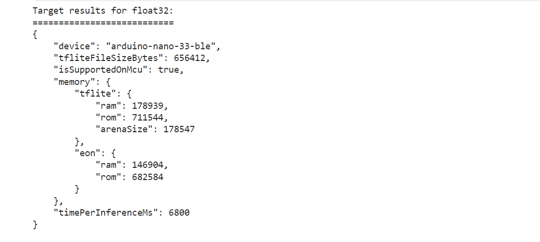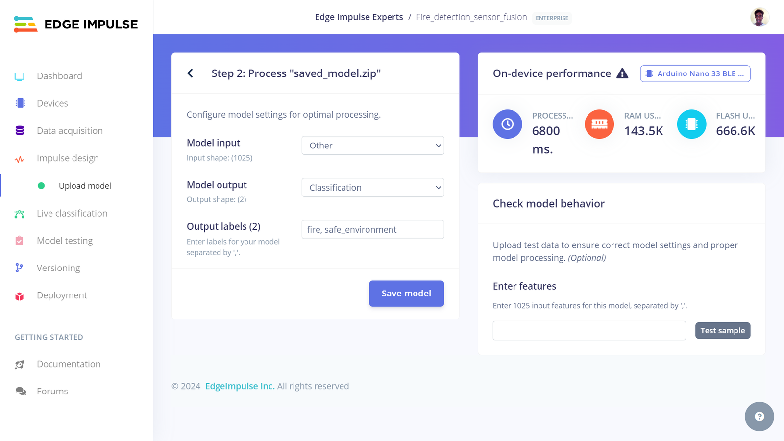After testing the model, the notebook uses the Edge Impulse Python SDK for profiling and this enables us to get RAM, ROM and inference times of our model on a wide range of hardware from MCUs, CPUs, GPUs and AI accelerated boards, incredibly fascinating! We can see the performance estimates for the Arduino Nano 33 BLE Sense in the screenshot below. Also, during this profiling, the model is uploaded to the Edge Impulse project. You can clone my public Edge Impulse project and access the model using this link: Fire_detection_sensor_fusion.