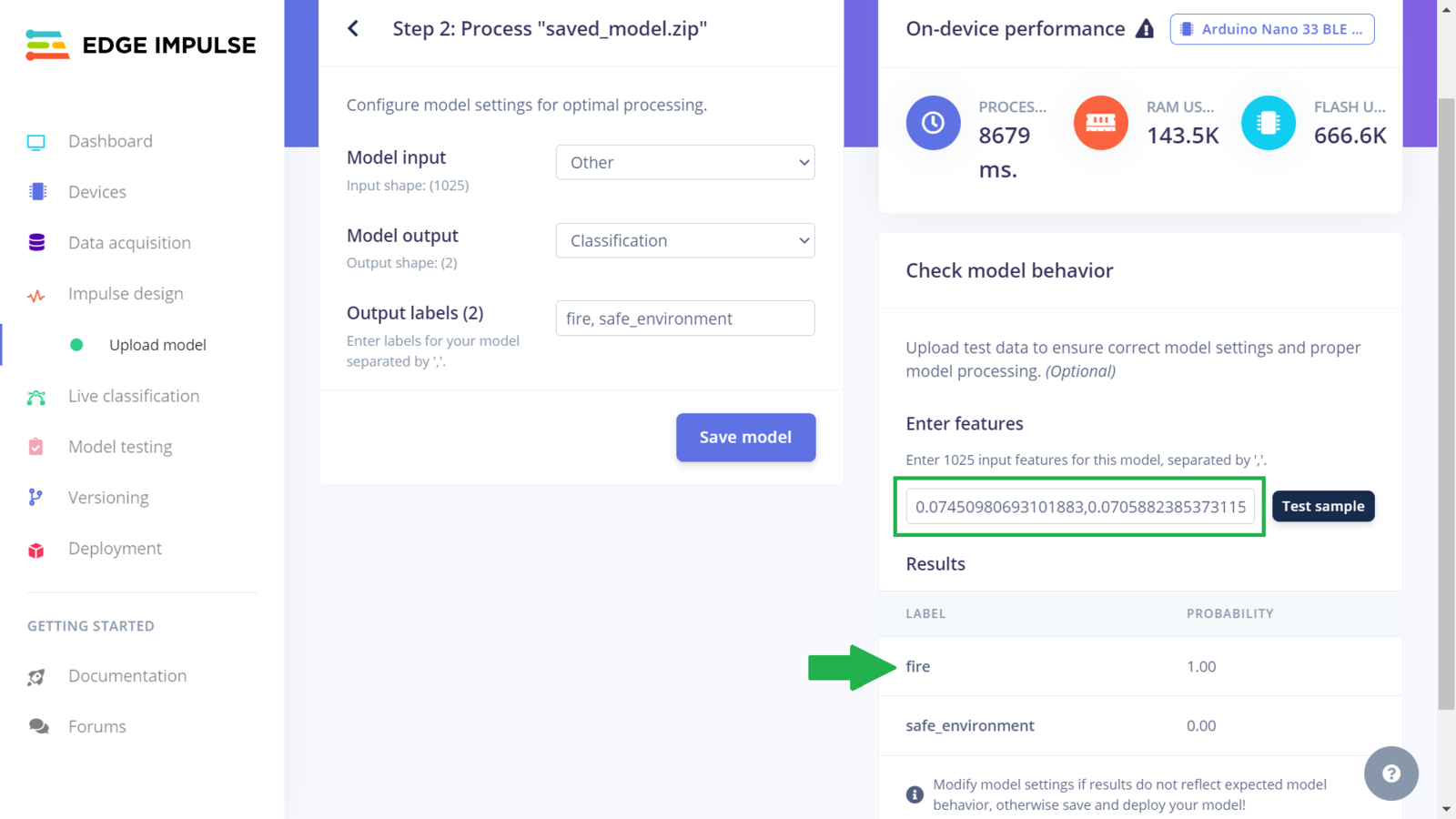 input_features.txt which can be seen in the notebook files. We can copy the contents of the text file and paste them in the Edge Impulse project to test our model on the platform. In the screenshot below, we can see that the model classified the features to belong to the fire class and this was the correct classification.