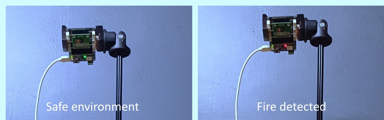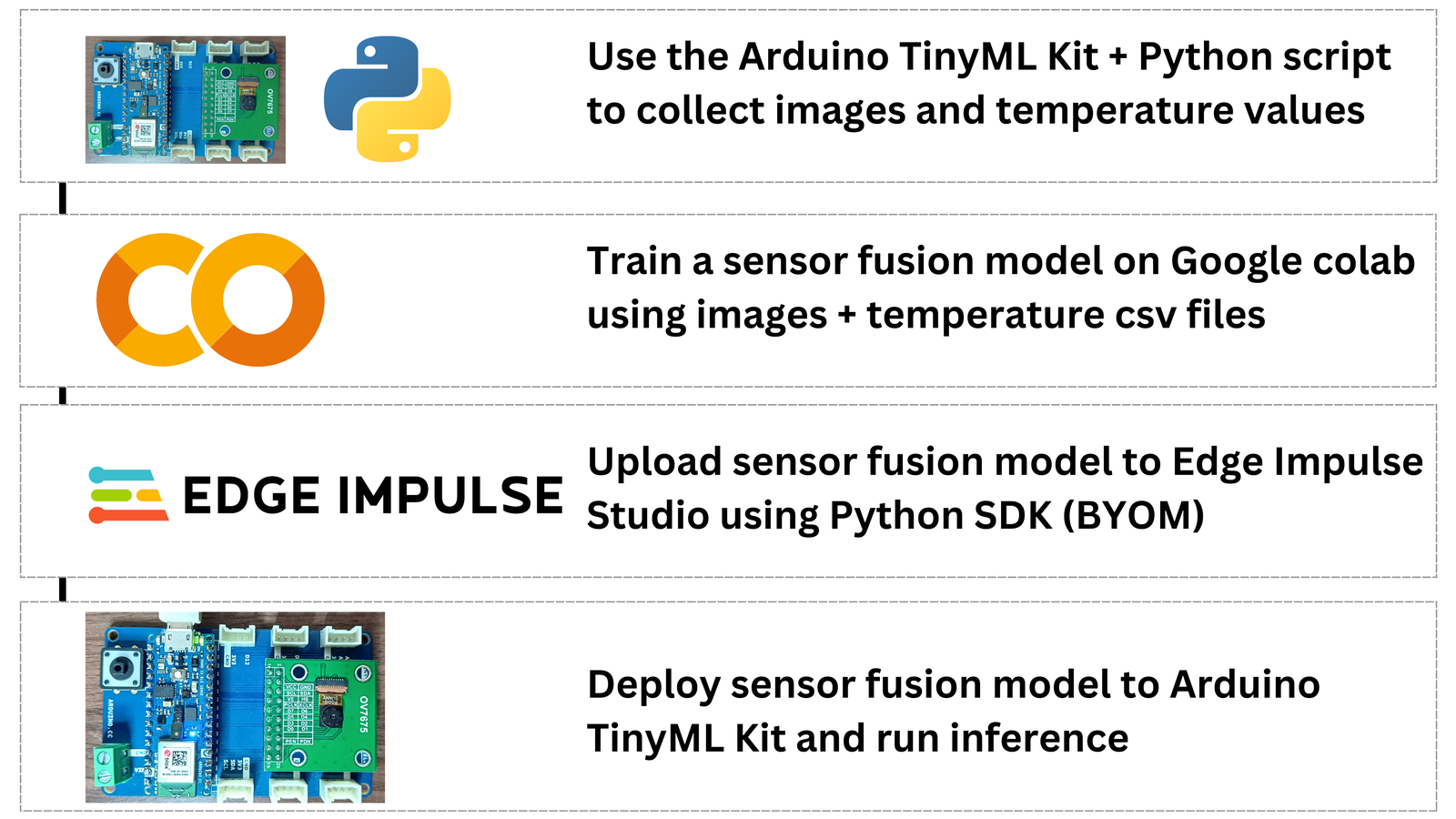 One of our greatest fears is the danger of a fire in our homes, workplaces, on our properties, or even while we are inside vehicles. Although devices and algorithms have been created to detect fires, they have their limitations. In some cases, there are limitations that are obtained by using the vision sensors, while in others a smoke detector can fail to detect a fire if the smoke is not reaching the sensor. To demonstrate sensor fusion, I trained a Machine Learning model to detect if an indoor fire is present using both image and environmental (temperature) data. I used a custom multi-input Convolutional Neural Network (CNN) model to classify if there is a fire or not. To achieve this, I utilized a tensor slicing technique to work with sub-sections of tensors. Each input to the model consists of both an image and a corresponding scalar value (temperature). The model’s input tensor is sliced into an image and temperature tensor. The outputs from these two tensors are then combined and processed further to produce an output (classification of the various classes). The tensor slicing technique is advantageous in this case as well because Edge Impulse does not support multi-input models at the time of this writing. Finally, after training and testing the model, I used the Edge Impulse platform to deploy the sensor fusion model to an Arduino Tiny Machine Learning Kit.