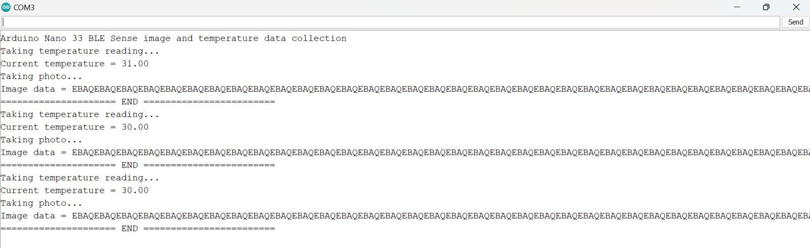 First, I created an Arduino sketch for the Arduino Nano 33 BLE Sense. The Arduino code records the room temperature using the onboard HTS221 temperature sensor and prints it via UART. Afterwards, the code captures an image using the OV7675 camera module. While working with the OV767X library, I realized that the code takes a very long time to capture an image. In this case, I modified the nano_33ble_sense_camera.ino camera example from Edge Impulse’s Arduino library deployment to capture an image. The Edge Impulse’s Arduino camera code for the OV7675 has a custom driver that makes it faster to get image data from the camera. After an image has been captured, it is then encoded to base64. For this, I utilized the open-source Edge Impulse’s Arduino Nano 33 BLE Sense firmware. From the code, I used parts of the take_snapshot function to take a snapshot, encode it as base64 and print it to UART. With this code, the Arduino Nano 33 BLE Sense constantly samples a snapshot and temperature value, and they are then printed via UART (Serial). Note that it is not a good idea to send Strings via Serial due to memory leaks, but in this case I worked with Strings. The image width and height can be controlled with the variables WIDTH and HEIGHT respectively; the default image size is 240x240 pixels. Note that increasing the image dimensions will increase the time that the Arduino board will take to capture an image and also for the Python script to decode the base64 data and save it to a .JPG image.